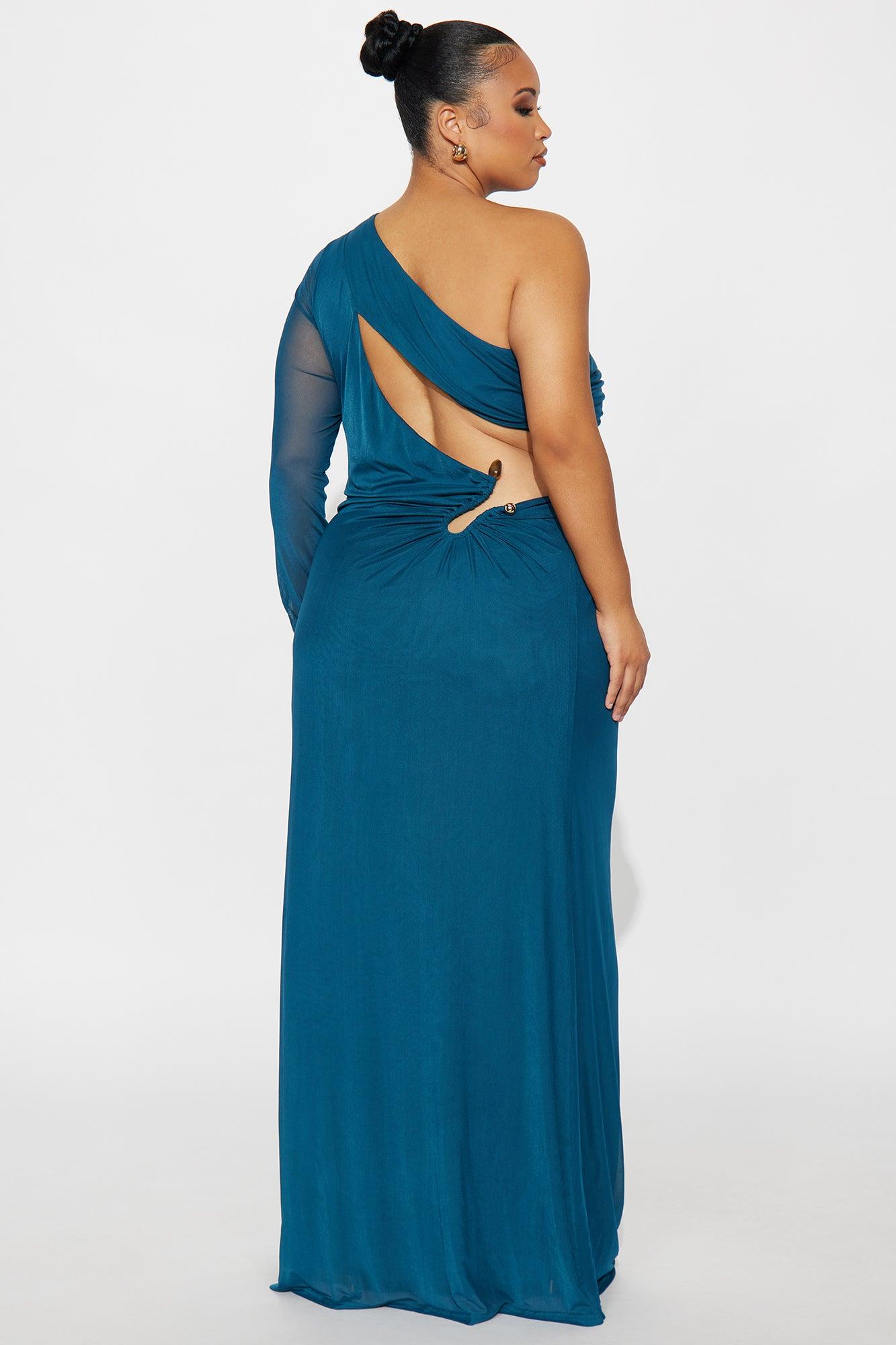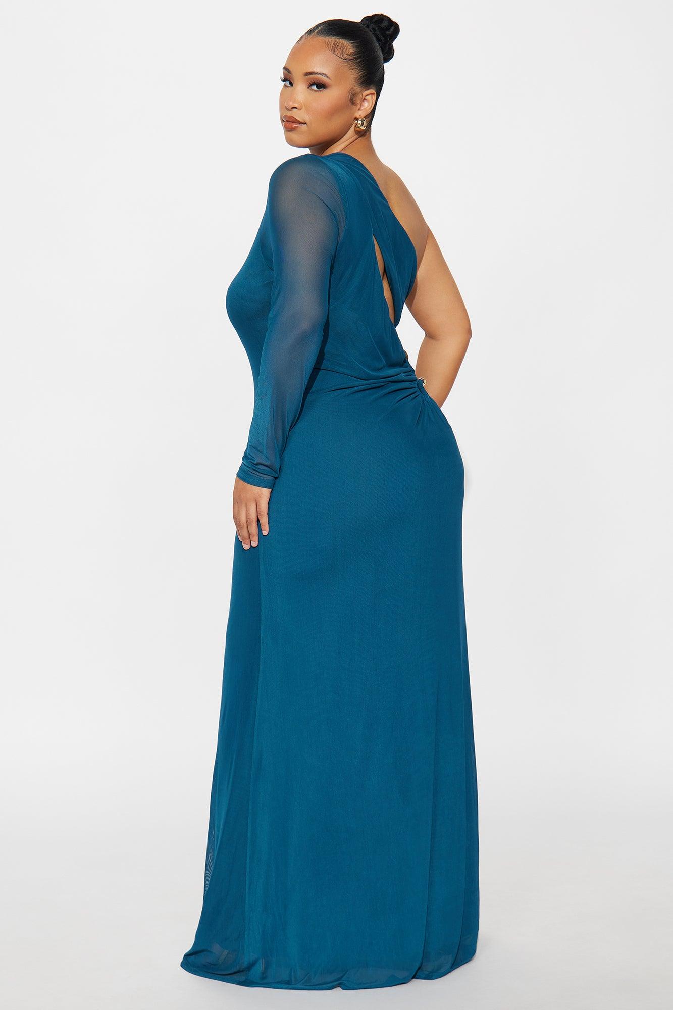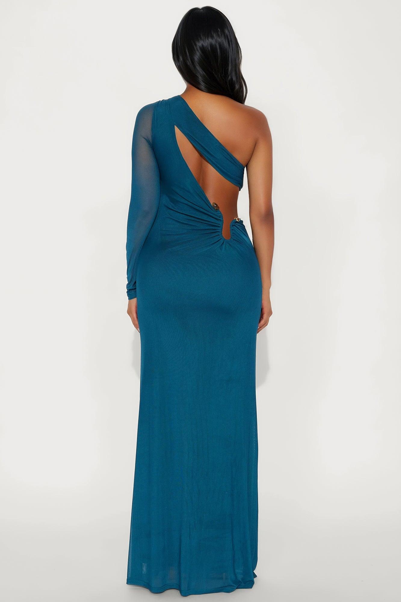Available In Brown And Teal. Mesh Maxi Dress One Shoulder with Sleeve Cut Out Detail Hardware Detail Lined Stretch Self : 100% Polyester Lining : 100% Polyester Imported California Proposition 65WARNING: Cancer and Reproductive Harm - www.P65Warnings.ca.gov.