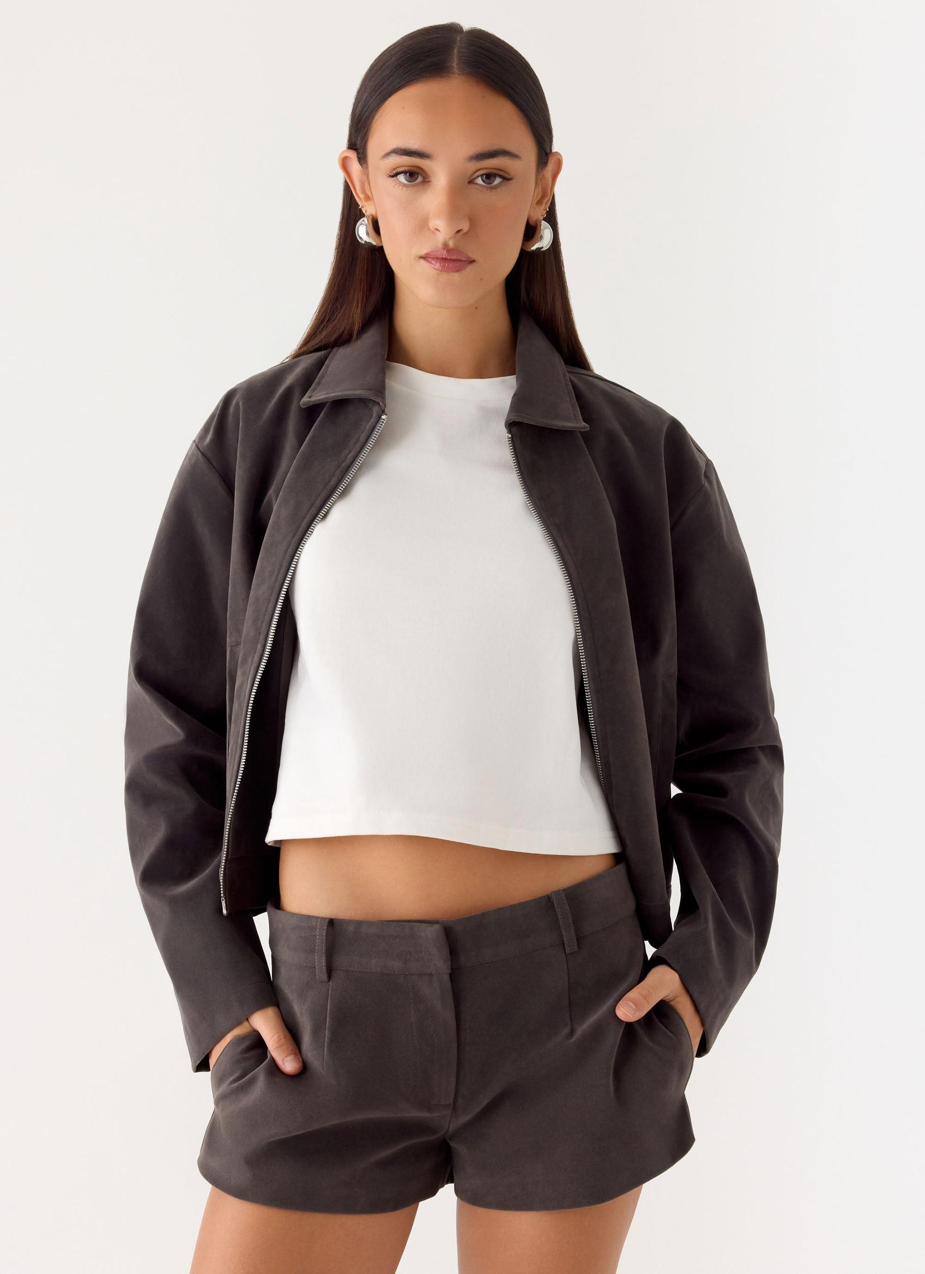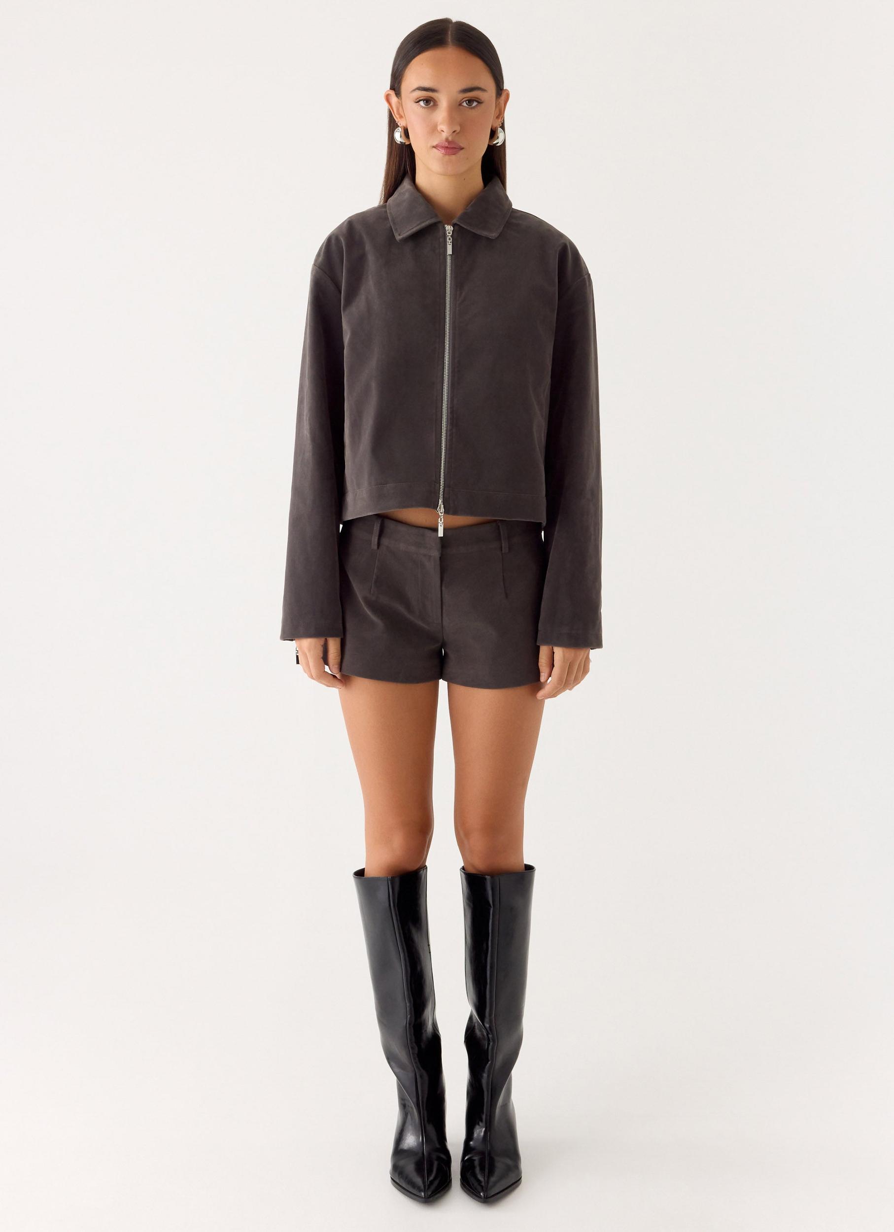 Peppermayo Exclusive The Jeremy Faux Suede Shorts are made for elevated daytime looks with a hint of edge. Sitting low on the waist with a mini length silhouette, these shorts are crafted in soft faux suede for a luxe feel. Fully lined and finished with an invisible zipper and pockets, they’re perfect for styling from brunch to sunset drinks. - Low rise- Mini length- Suede fabric- Fully lined- Invisible zipper- Pockets- Fabric: 50% PU, 50% Polyester Size AU 8 / US 4 garment measurements: Length: 26 cm / 10.24 inWaist: 78 cm / 30.71 inHip: 103 cm / 40.55 in Roberta is 177cm and wears size AU 6 / size US 2