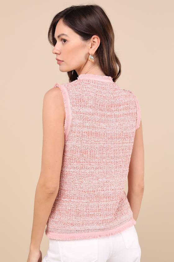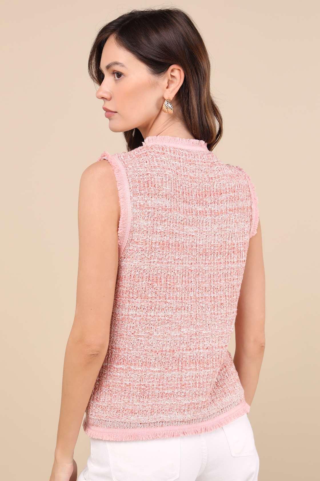 Keep things chic and sweet with this sleeveless top that boasts a boucle knit texture across the vest-like silhouette. A trio of faux pearl buttons runs along the front of the sleeveless bodice, along with two welt pockets with matching buttons and two patch pockets. Frayed trim completes the look.