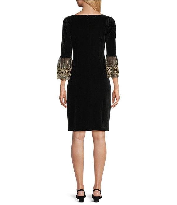 From Jessica Howard, this dress features: Stretch velvet fabrication Crew neckline 3/4 sleeves Lace trim bell sleeve detail Side tuck Sheath silhouette Lined Center back zipper closure Approx. 39" in length from high point shoulder Polyester/spandex Hand wash cold/lay flat to dry Imported.
