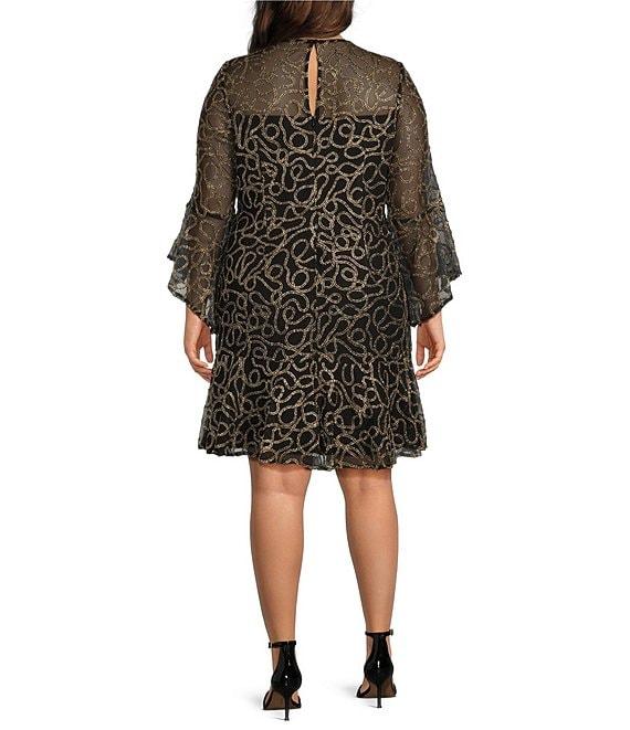 Jessica Howard Plus Size Embellished Mesh Round Neck 3/4 Bell Sleeve Flounce Hem Dress