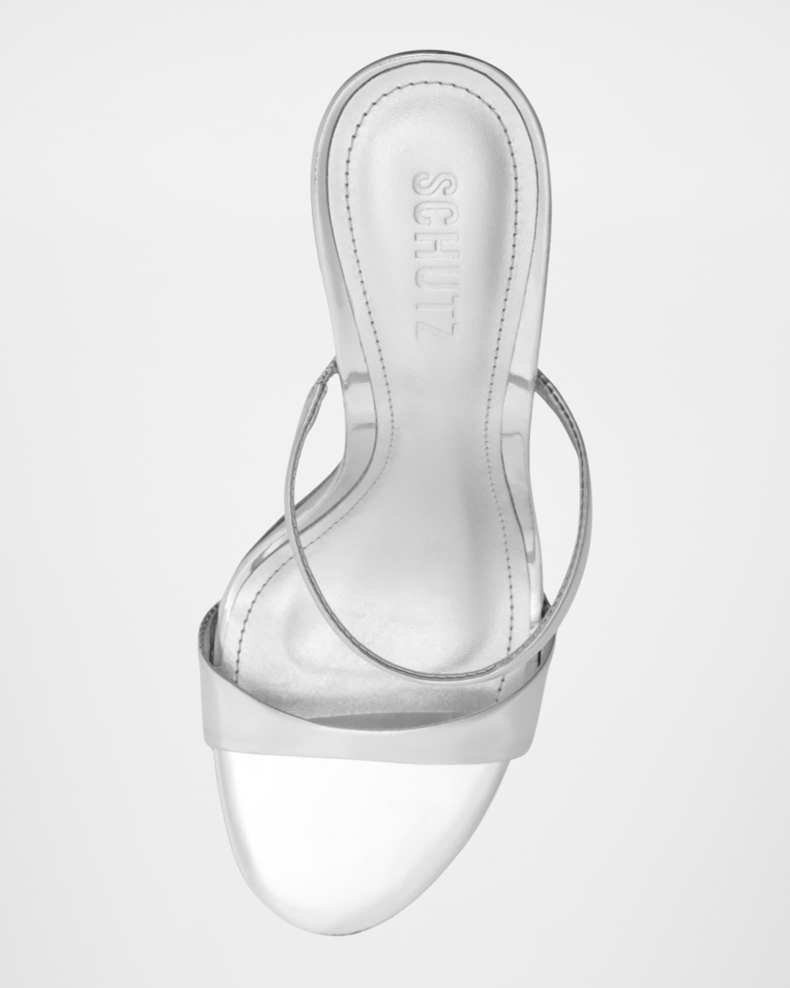 Schutz sandals in metallic leather defined by a striking high-stiletto silhouette to elongate, accentuate, and captivate 4.00 in / 100 mm stiletto heel Open toe Elasticized single strap vamp Synthetic lining Leather outsole Spot clean Made in Brazil