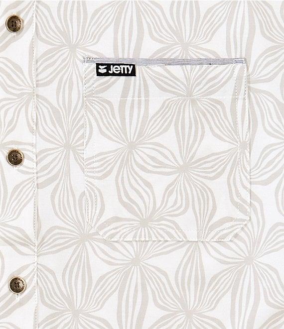 From JETTY, this shirt features: Allover print Point collar Short sleeves Button-front closure Custom brass buttons Patch pocket on left side of chest Modern stretch woven fabric Repreve RPET/polyester/cotton/spandex Machine wash/tumble dry Imported.