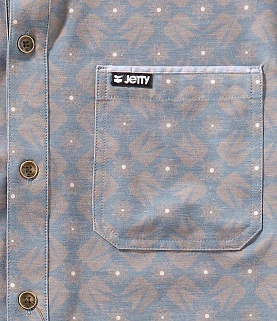 From JETTY, this shirt features:Allover JETTY printsPoint collarShort sleevesButton-front closureCustom brass buttonsPatch pocket on left side of chestModern stretch woven fabricRepreve RPET/polyester/cotton/spandexMachine wash/tumble dryImported.