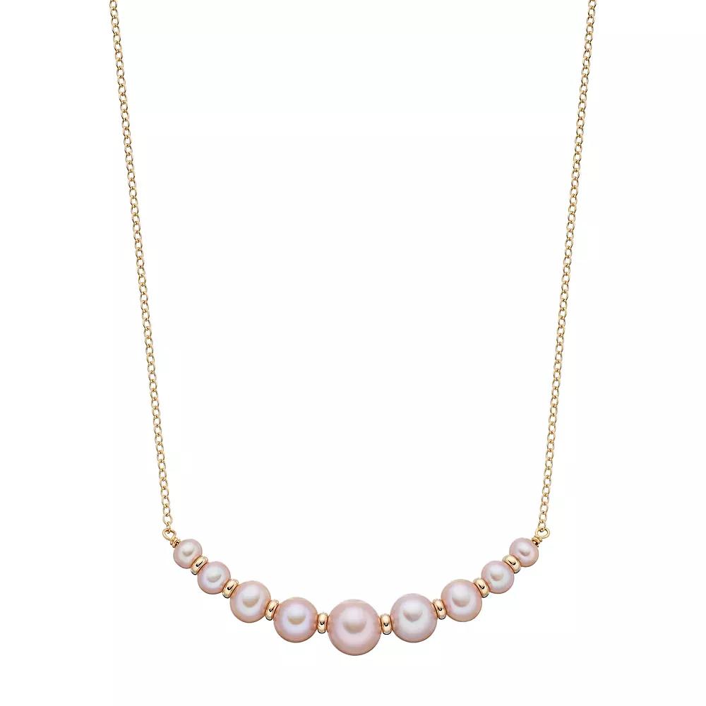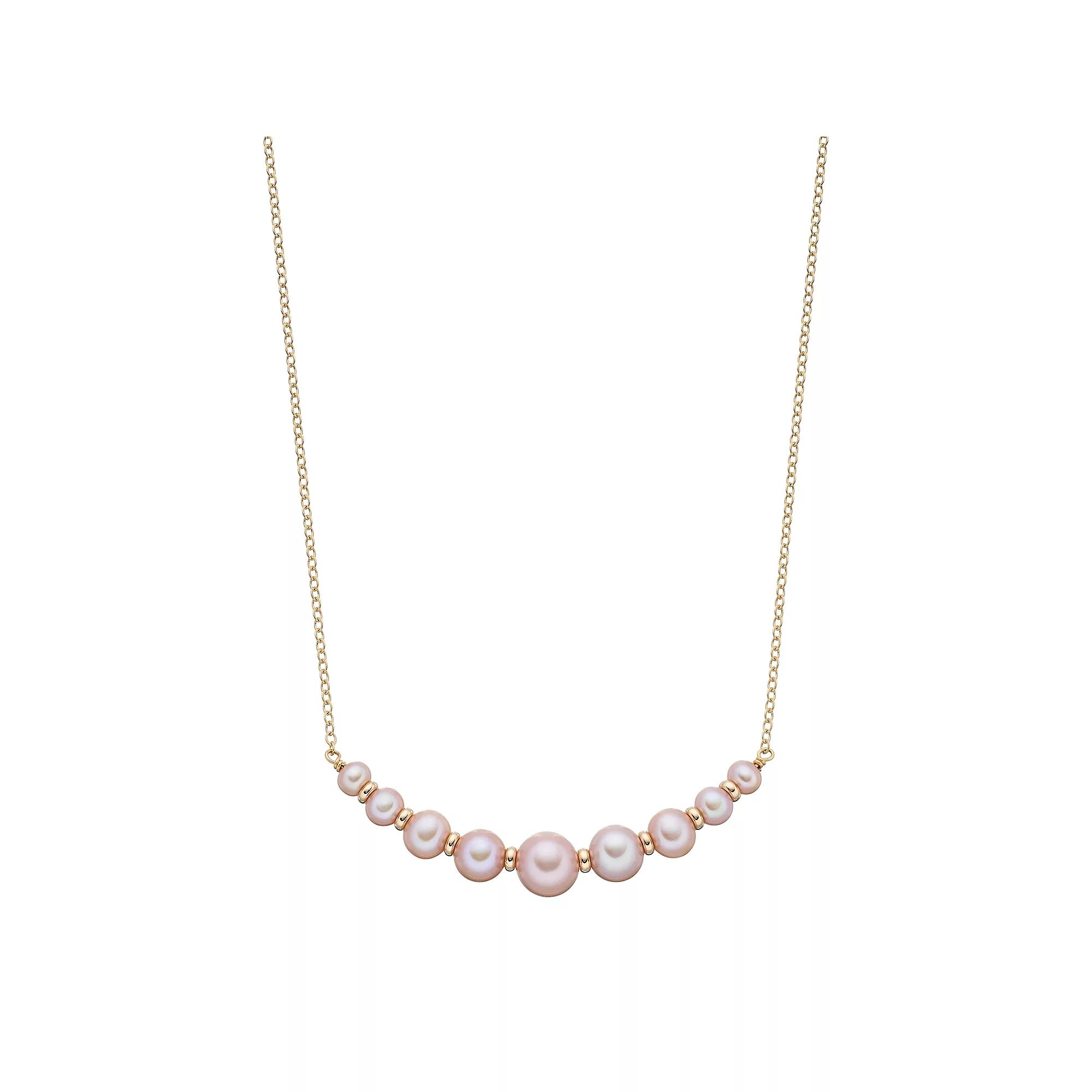 Adorned with alternating pink freshwater cultured pearls and 14k gold rondelle beads, this curved bar necklace provides elegant allure.NECKLACE DETAILS Length: 18 in. Clasp: lobster-claw Metal: 14k goldMay contain 14k gold filled connection wire Packaging: boxed CULTURED PEARL DETAILS Type: freshwater Shape: round Size: 3.5-9 mm Color: pinkGemstones may have been treated to enhance their appearance. Special care may be required. Please visit our Gemstone Treatment & Special Care Guide for more information. Size: 18". Gender: female. Age Group: adult.
