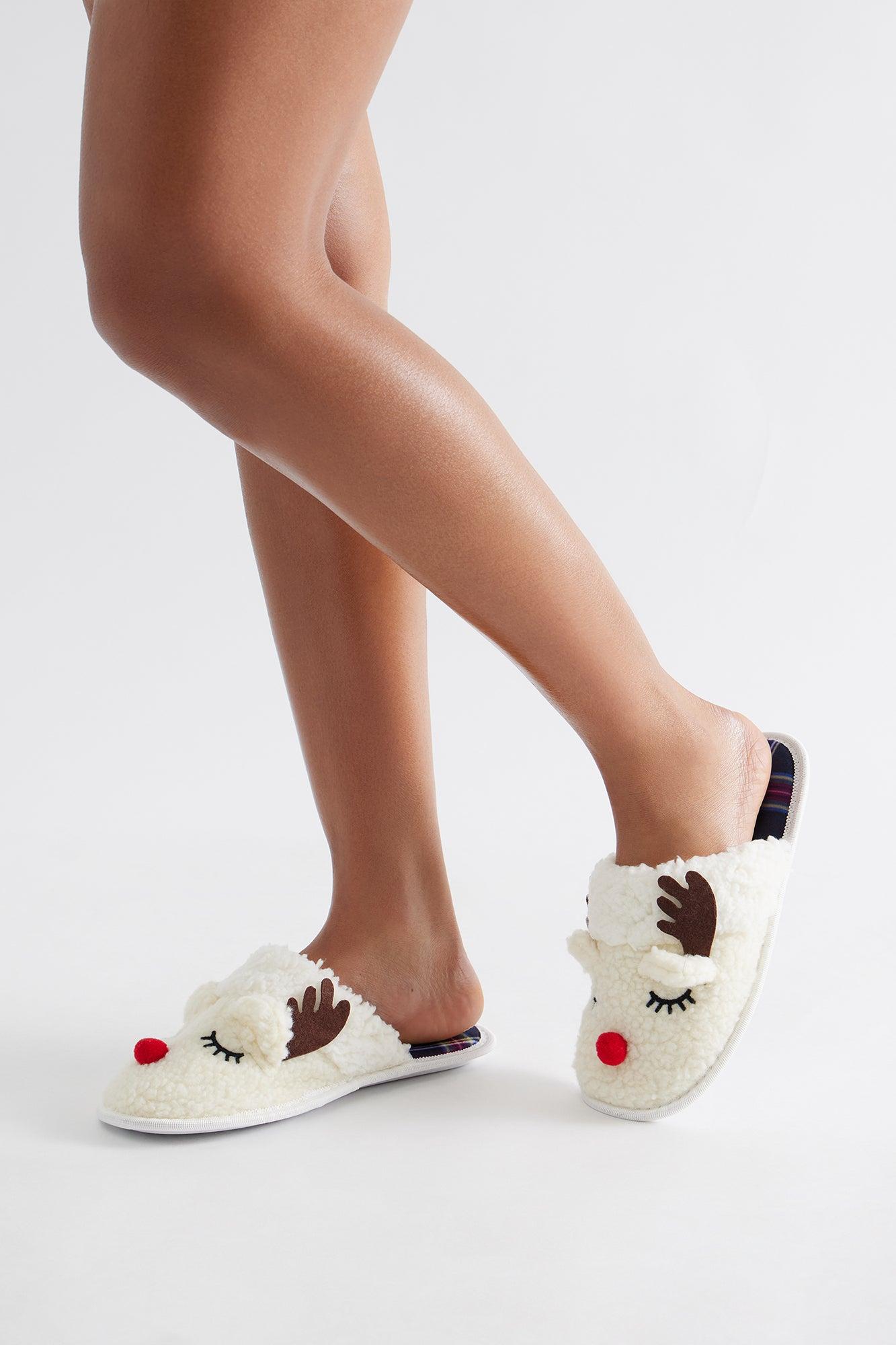 Available In Black, Brown And White. Close Toe Slippers Sherpa Reindeer 3D Applique Round Toe Flat Heel Imported California Proposition 65WARNING: Cancer and Reproductive Harm - www.P65Warnings.ca.gov.