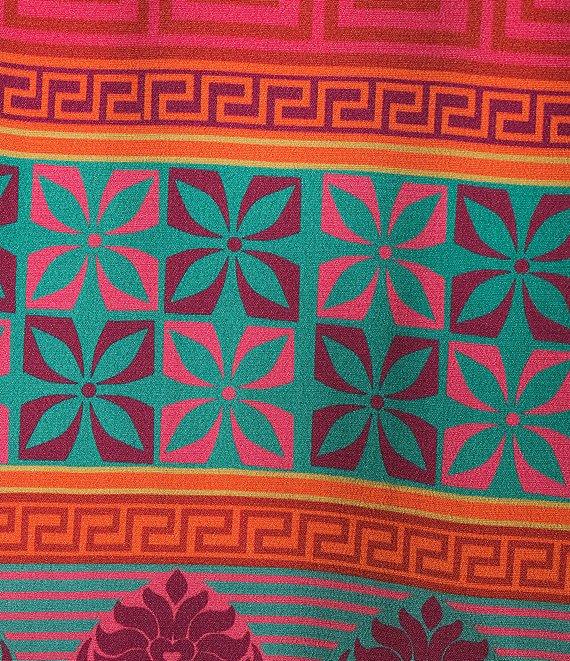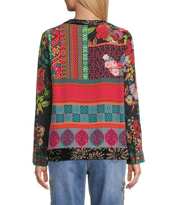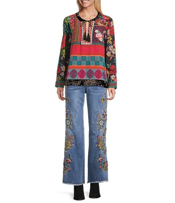 From John Mark Plus, this tunic features: Woven fabrication Split neckline with tassel ties Long roll-tab sleeves Floral embroidery with center sequins on bib Mixed print Loose fit Straight hem with side vents Pullover construction Approx. 26" length, Rayon/viscose Machine wash cold Imported.
