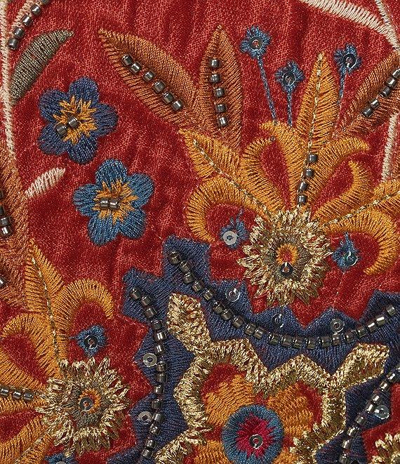 From John Mark, this vest features: Velvet fabrication Multi floral and plaid patch print Round neckline Sleeveless Beading floral details Lining paisley printed Scalloped hemline Open front; no closure Approx. 22.5" length Polyester/cotton Lining rayon Machine wash/line dry Imported.