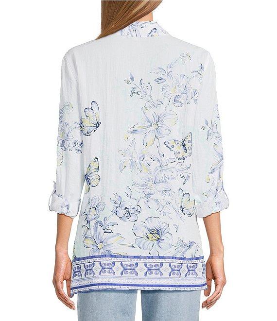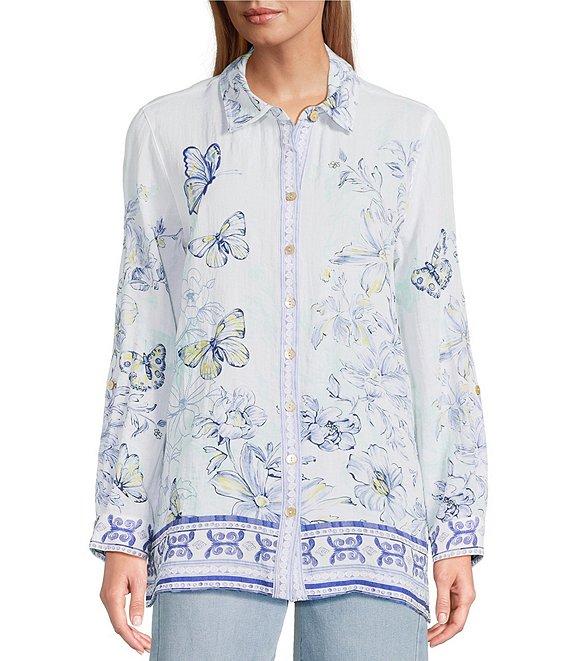 From John Mark, this blouse features: Woven fabrication Point collar Long roll-tab sleeves Floral, butterfly with seamless border print Loose fit Straight hem with side vents Straight hemline with curved sides Button front closure Approx. 30" length Rayon/nylon Machine wash/tumble dry Imported.