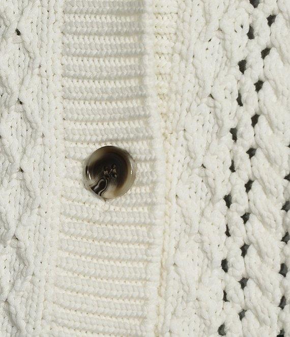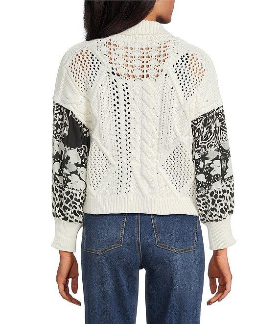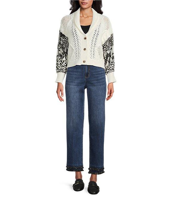 From John Mark, this cardigan features: Knit fabrication Shawl collar neckline Long sleeves Patchwork print Embroidery Ribbed cuffs Straight hemline Button front closure Approx. 21" length Body: cotton/nylon; sleeves: rayon/exclusive of decoration Turn inside out/machine wash cold/dry flat Imported.