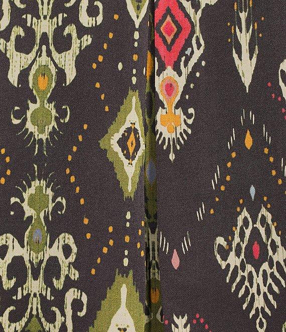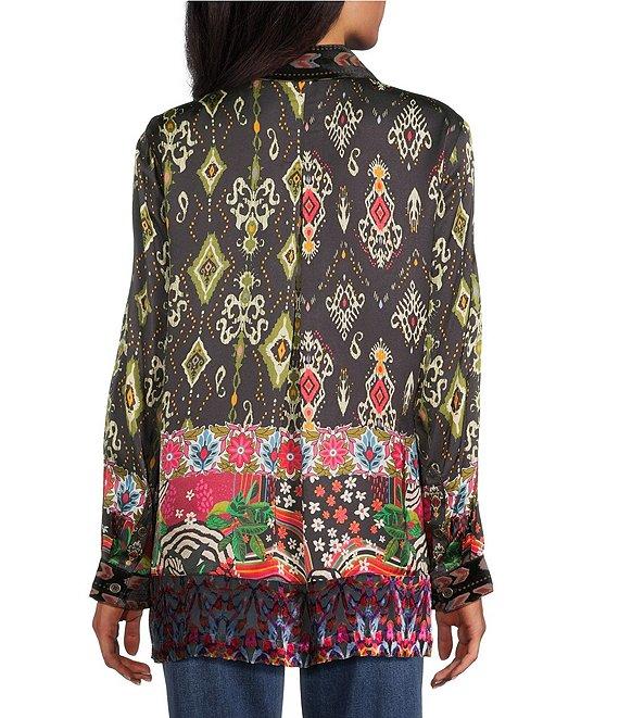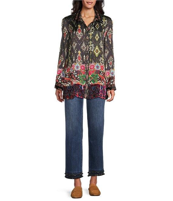From John mark, this tunic features: Velvet burnout fabrication Point collar Long sleeves Button cuffs Mixed media print Straight hem with side vents Button front Approx. 30.5" length Rayon/viscose/nylon Machine wash cold/tumble dry Imported.