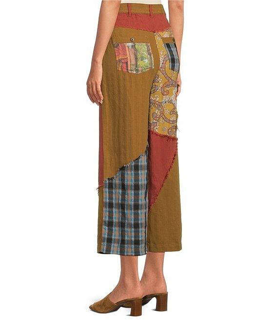 From John Mark, these pants feature: Wide leg silhouette Patchwork floral and solid colors Five-pocket styling Fringe detailing on the hemline Front button/zipper fly closure Approx. 26" inseam Solid- Cotton/linin/lyocell Blue plaid-cotton/polyester/viscose Print-viscose Machine wash cold/ tumble dry Imported.