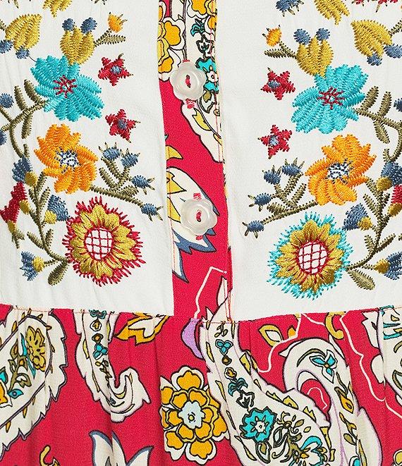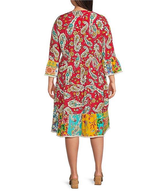 From John Mark Plus this dress features: Woven fabrication Shift silhouette Split v-neckline Elbow-length bell sleeves Allover multi floral print Embroidery motif Pullover construction Approx. center front 43.25", 42.75" center back length Rayon/viscose, exclusive of decoration Machine wash Imported.