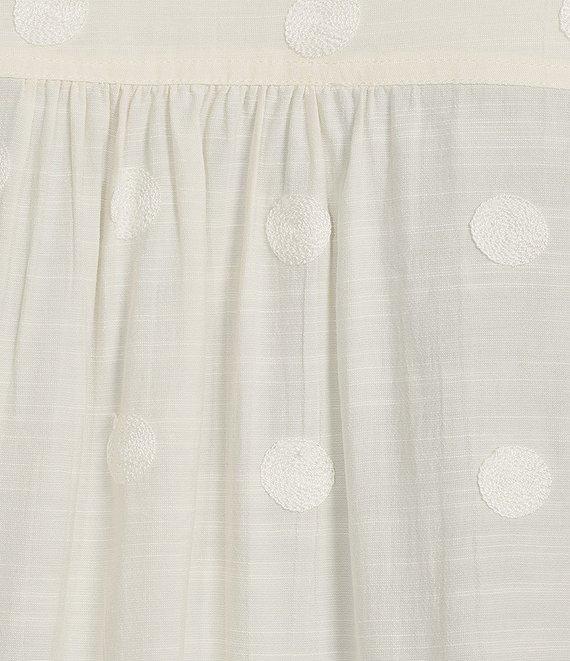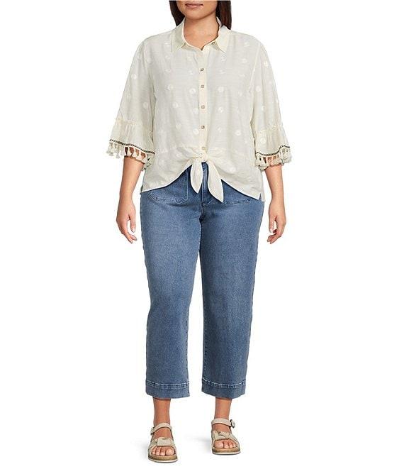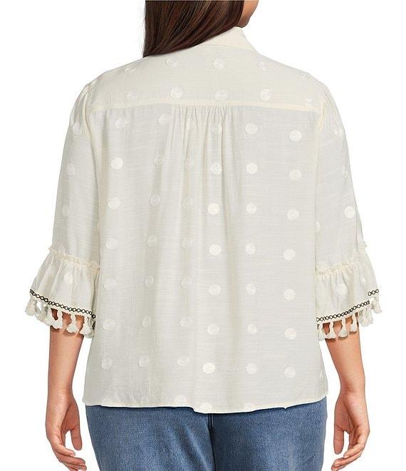 From John Mark Plus, this blouse features: Woven fabrication Point collar 3/4 flounce sleeves All-over embroidered dots Loose fit Tassel trim detail Tie-front hem Button-front closure Approx. 26" front length, 27" back length Rayon/polyester Machine wash cold Imported.