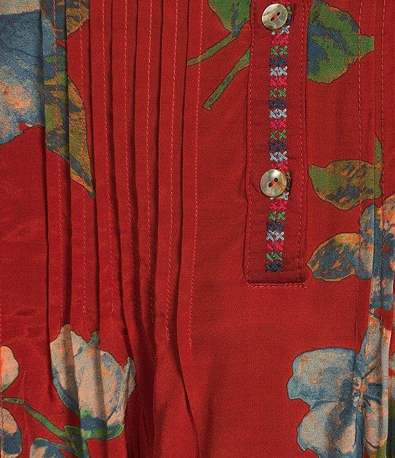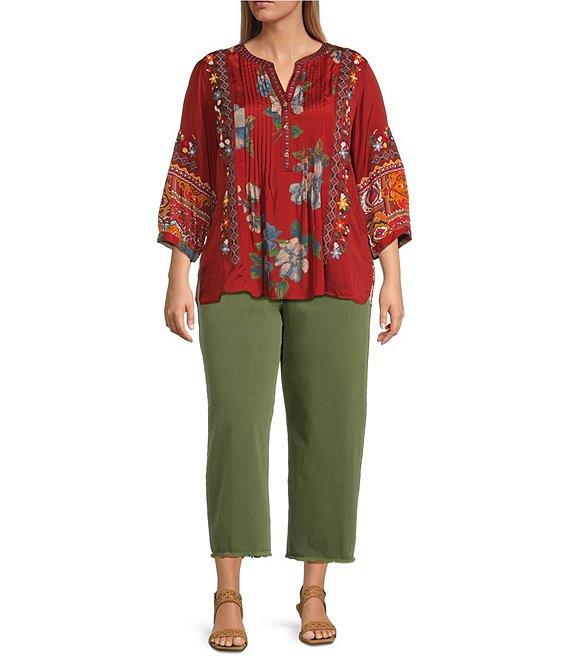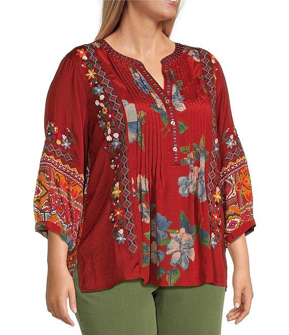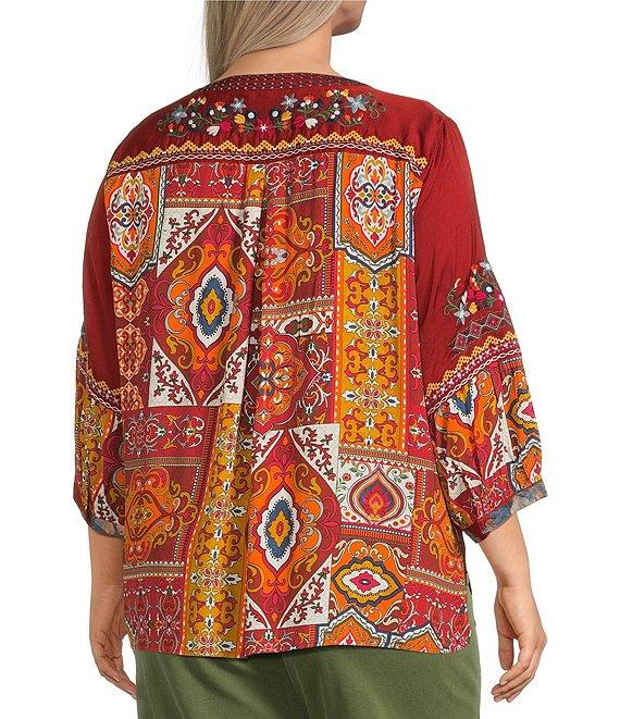 From John Mark Plus, this tunic features: Split v-neckline 3/4 sleeves with button cuffs Embroidered motif Multi patch print Loose fit Slight hi-low hem with side vents Pullover construction Approx. 28.5" center-front length; 29" center-back length Rayon/viscose Machine wash cold with like colors on gentle/tumble dry low; cool iron if needed Imported.