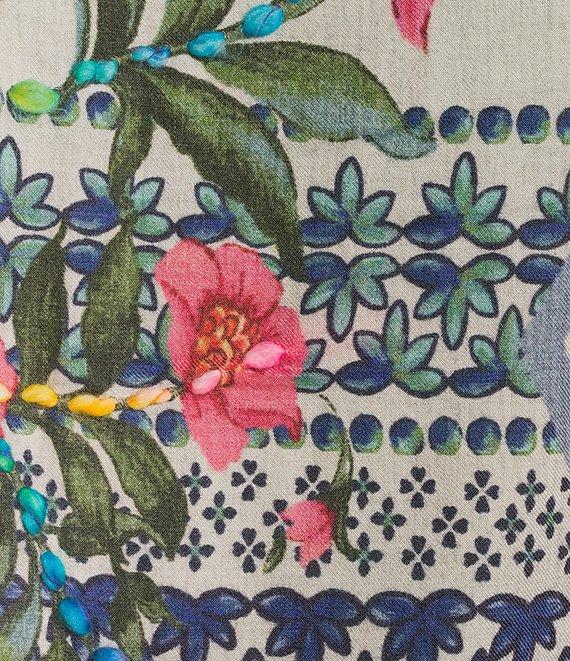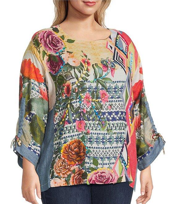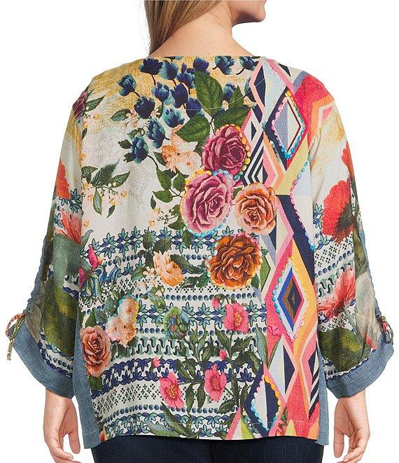 From John Mark Plus, this tunic features: Woven fabrication Tunic silhouette Scoop neckline 3/4 cinched tie sleeves Loose fit Front embroidery stitching Geometric floral border print Straight hem with side vents Pullover construction Approx. 28.5" length Wool/lyocell/ inset: lyocell; exclusive of decoration Hand wash Imported.