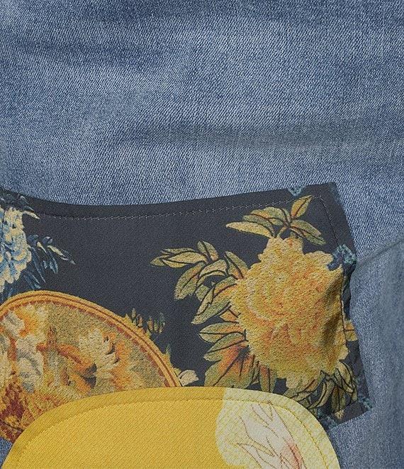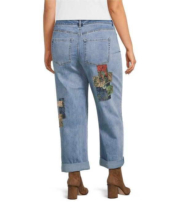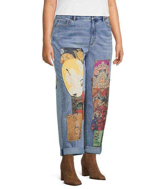 From John Mark Plus, these jeans feature: Denim fabrication Loose fit 5 pocket styling Front and back multi patch print Front button/zip closure Approx. 28" inseam Cotton/polyester/rayon/spandex; applique: polyester Machine wash/tumble dry Imported.