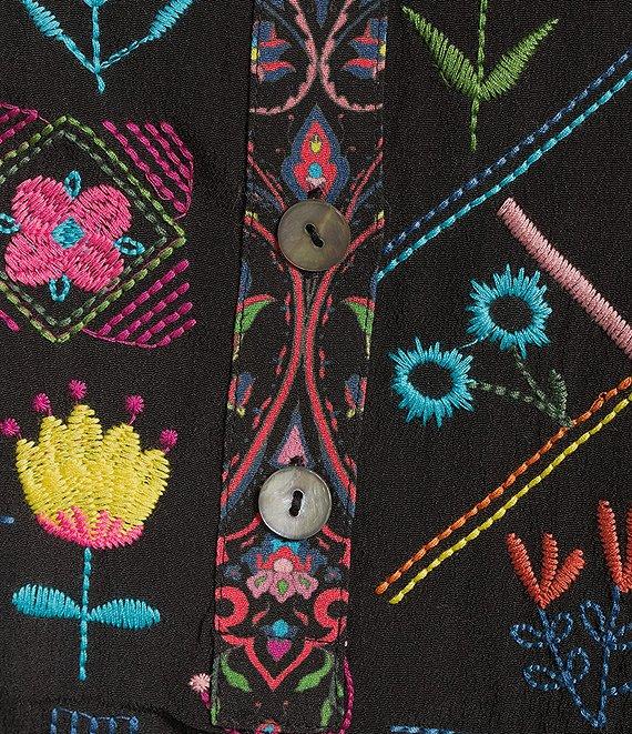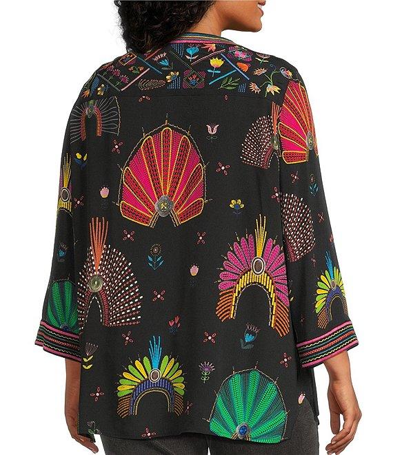 From John Mark Plus, this tunic features: Woven fabrication Band collar 3/4 cuffed sleeves Embroidered motif Loose fit Hi-low hem Pullover construction Approx. 29" center front length; 30" center back length Viscose/rayon; exclusive of decoration Machine wash/tumble dry Imported.
