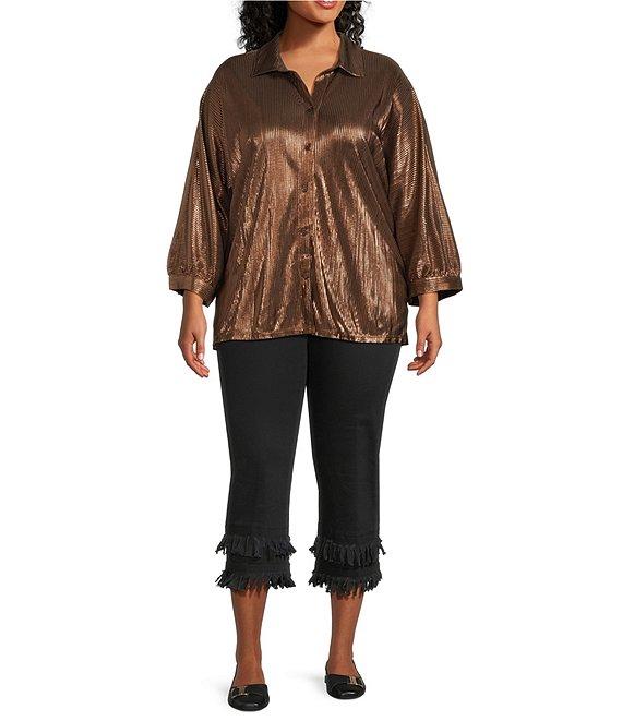 From John Mark Plus, this blouse features: Woven fabrication Point collar Short dolman sleeves Loose fit Shimmer pleat Slightly hi-low hem with side vents Button-front closure Approx. 29" front, 29.5" back length Polyester Machine wash Imported.