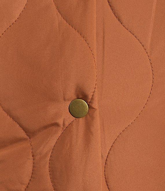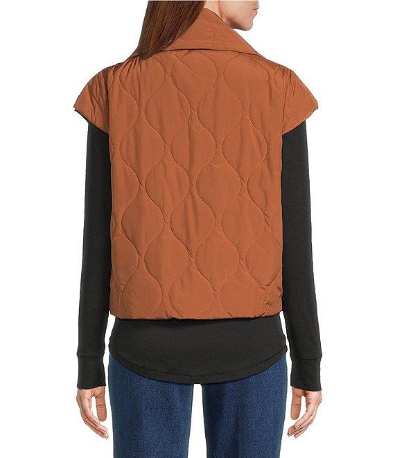 From John Mark, this vest features: Light puff quilted fabrication Oversized point collar Cap sleeves Side seam pockets Straight hemline Snap front closure Approx. 23" center front; 23.25" center back Polyester Machine wash/tumble dry Imported.