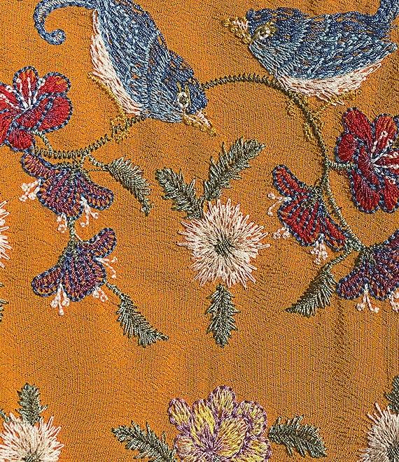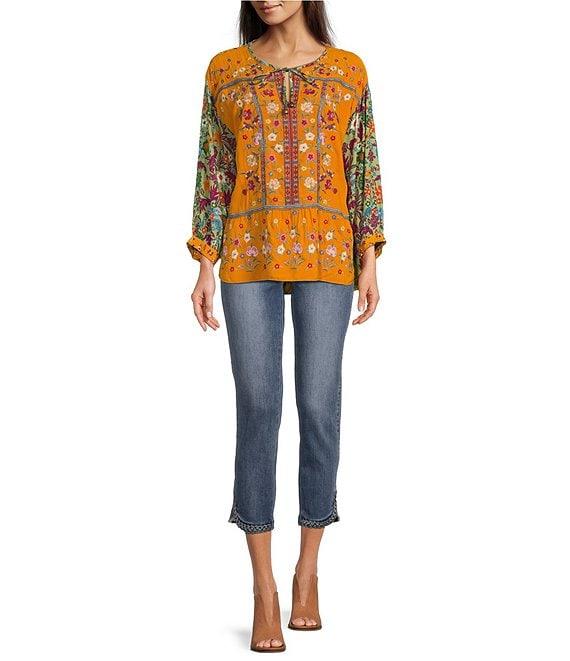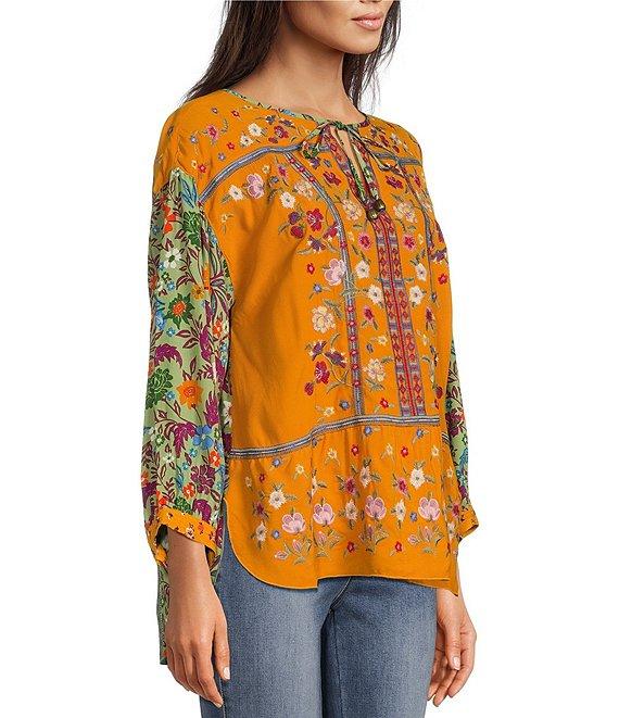 From John Mark, this tunic features: Woven fabrication Split neckline with tie front detail 3/4 sleeves Floral embroidered print Back embroidered yoke detail Loose fit Straight hemline Pullover construction Approx. 26.5" front length; 27.5" back length Rayon/viscose Machine wash Imported