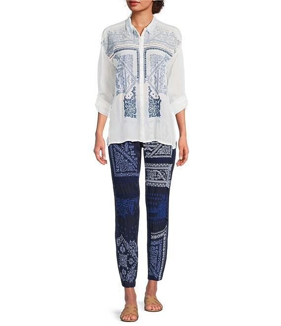 From JOHNNY WAS, these joggers feature: Stretch woven fabrication Embroidered bandana pattern Jogger slim leg silhouette Belt loops on waistband Side front pockets and welt back pockets Front fly with zipper and button closure Approx. 26.5" inseam Cupro / rayon Hand wash Imported.