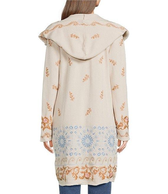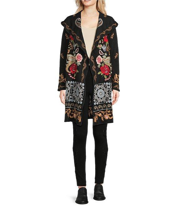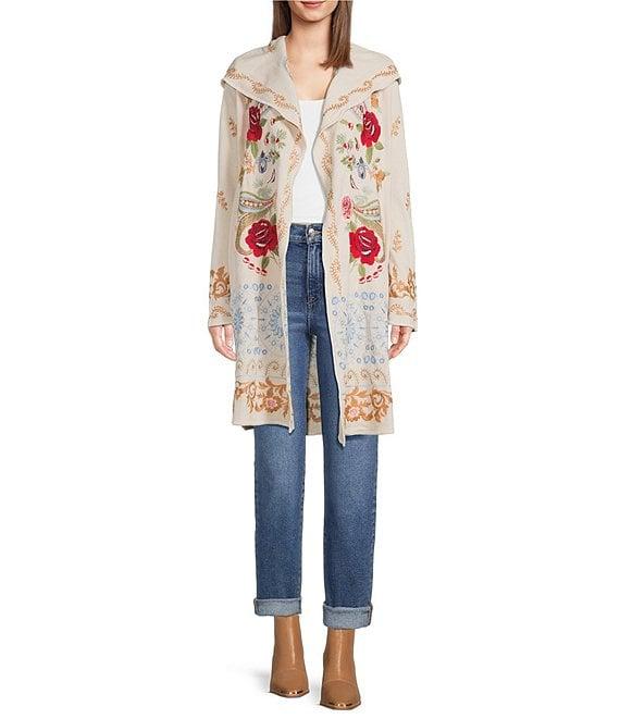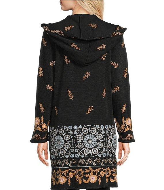 From JOHNNY WAS, this duster features: Textured cozy knit fabrication Intricate floral embroidered detailing Hooded shawl collar Long sleeves On-seam side pockets Straight hem Open-front; no closure Approx. 37" in length length Polyester/rayon Dry clean Imported.