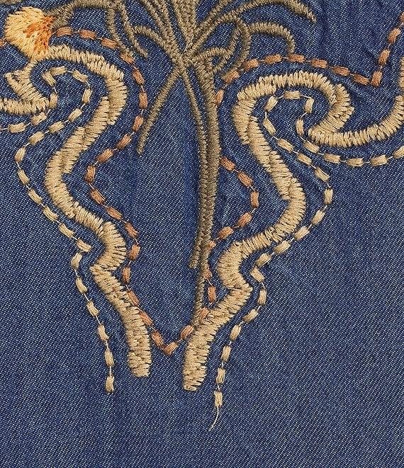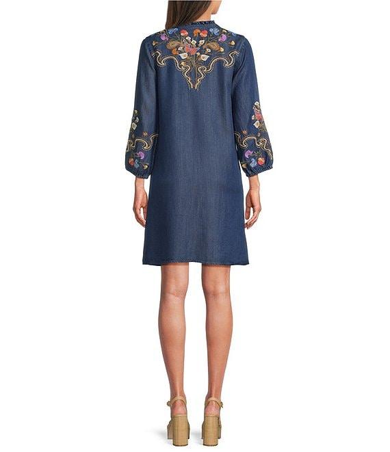 From JOHNNY WAS, this dress features: Denim fabrication Floral embroidered front and back yoke Split v-neckline Long sleeves with elastic cuffs and embroidery Side seam pockets Straight hem Pullover construction Approx. 37" length Lyocell Machine wash Imported.