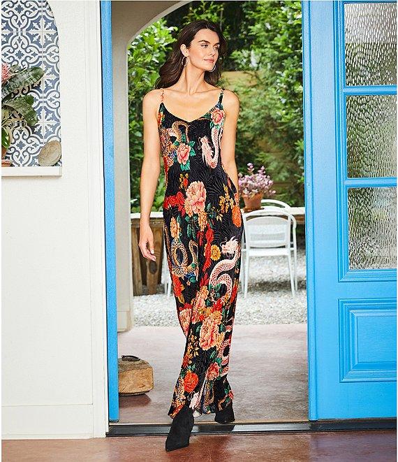 From JOHNNY WAS, this dress features: Burnout velvet fabrication Vibrant floral and dragon print Slip dress silhouette V-neckline front and back Sleeveless with shoulder straps Straight hem Lined Pullover construction approx. 53.5" length Rayon/silk Dry clean Imported.