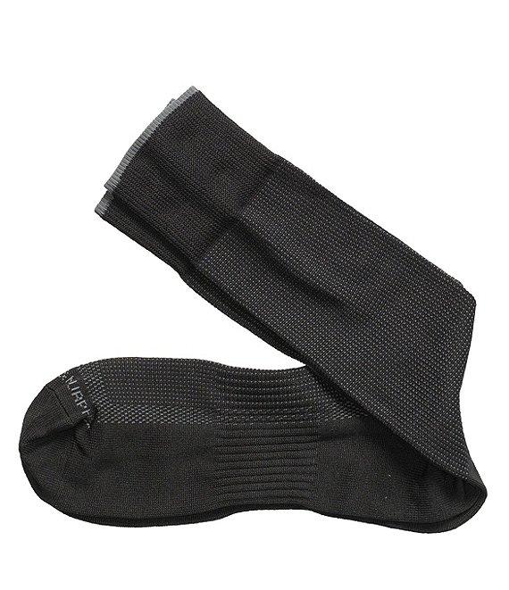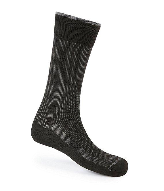 Offered in a modern, pindotted design, the First in Comfort dress sock from Johnston & Murphy is specially knit with an arch support and offers high-performance comfort. Innova polypropylene/nylon/spandex One size fits men's shoe sizes 9-13 12.5" slack length Made in the USA.