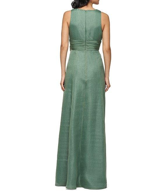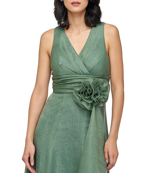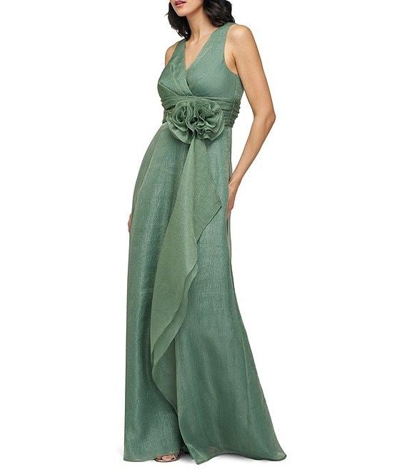 From JS Collections, this gown features:Aline silhouetteOrganza fabricationV-necklineSleevelessPleated bodiceShirred waist seam with 3D floral appliqueRuffle front detailFront slitZip back closureLinedApproximate length 60.5"PolyesterDry cleanImported.