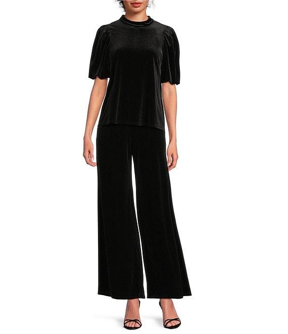 From Jude Connally, these pants feature: Stretch velvet fabrication Flat front Wide leg silhouette Side seam pockets Pull-on construction Approx. 30" inseam Polyester/spandex Machine wash Imported.
