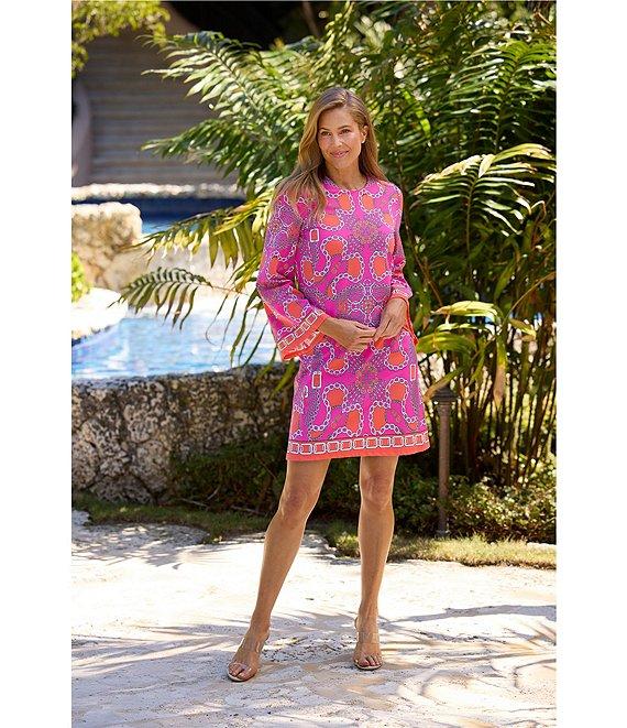 From Jude Connally, this dress features: Jude cloth fabrication Swing silhouette Heritage chains print Crew neckline Long bell sleeves Straight hem Pullover construction Approx. 34" length Nylon/spandex Machine wash Imported.