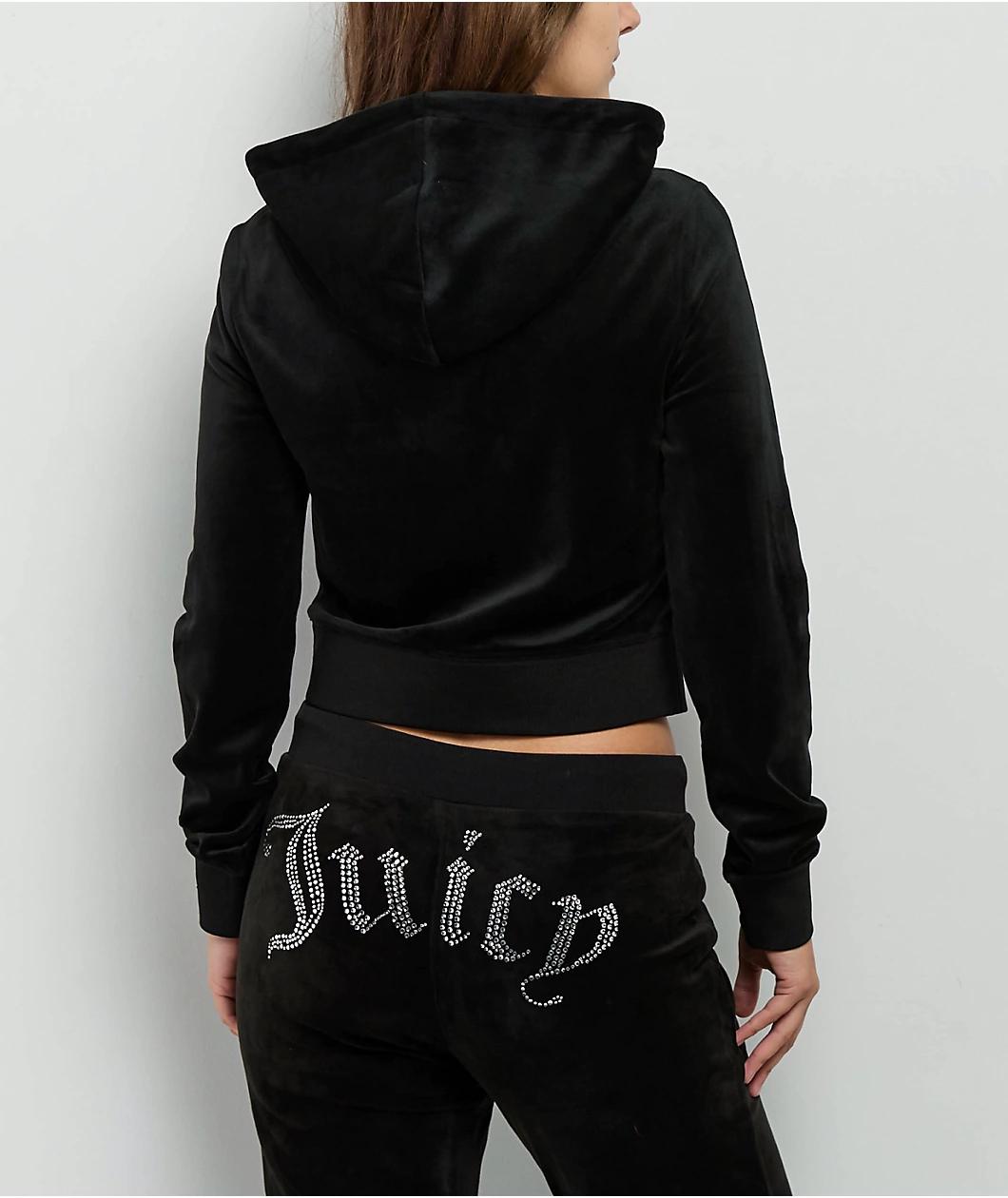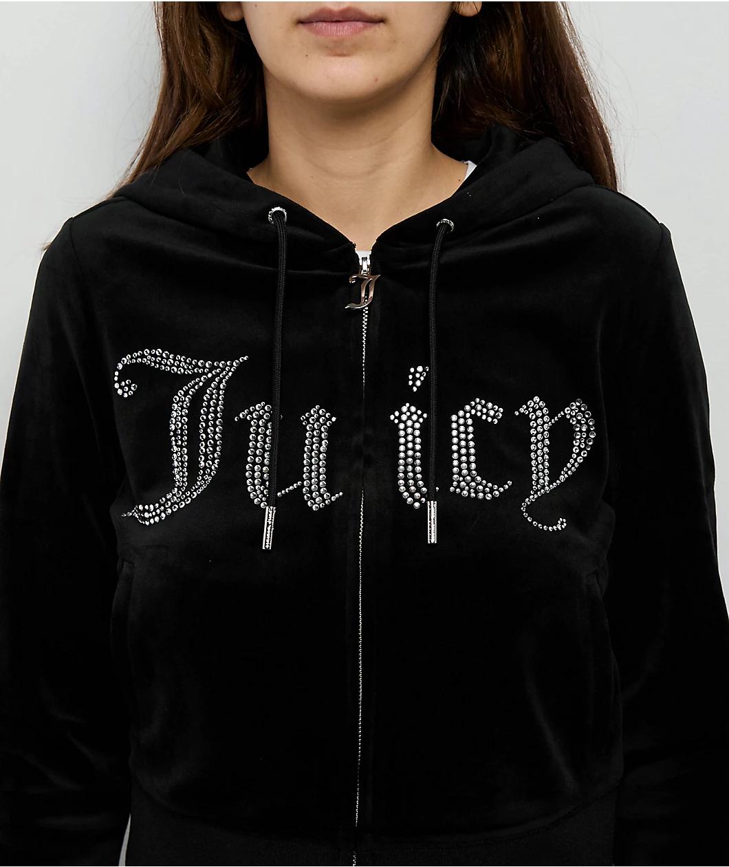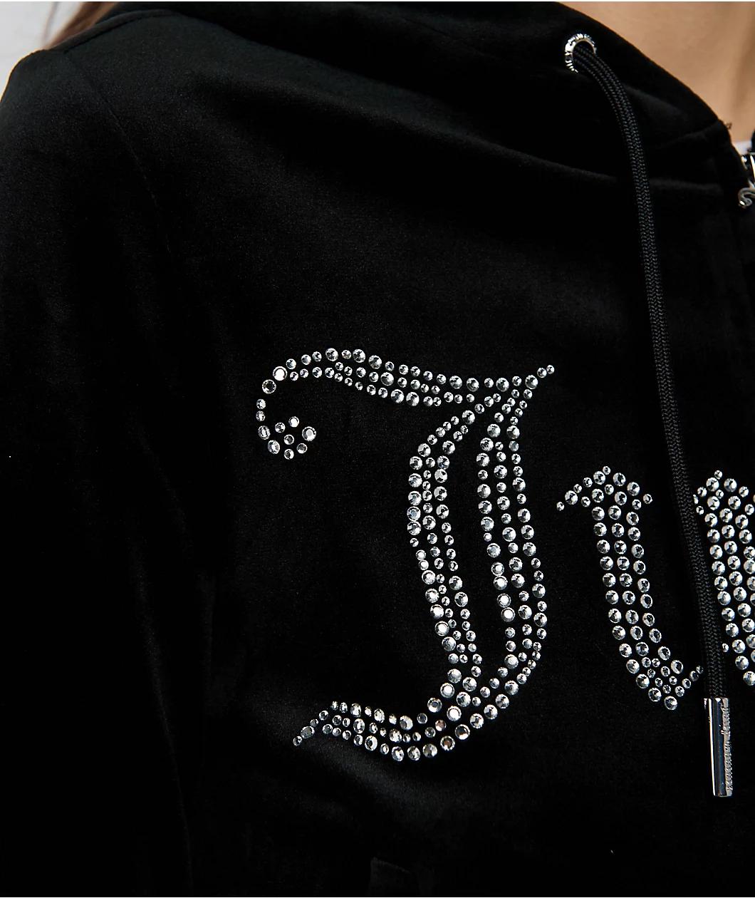 Juicy Couture flips the script with the Front Bling Licorice Velour zip hoodie, putting the iconic rhinestone logo front and center. This zip-up features the OG velour feel in a rich, Juicy-exclusive Licorice black color, finished with hidden thumbho