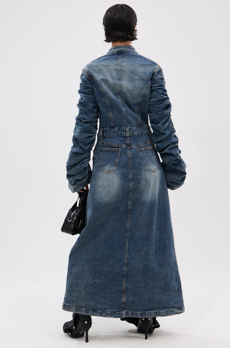 Function meets fierce in The AKIRA Label Jules Denim Trench. Crafted from dark-wash denim, this full-length coat features a sharply tailored silhouette with a high buckled collar, dramatic ruched sleeves with ribbed knit cuffs, a cinched bodice with a front zip closure and curved seaming, functional belt loops at the waist, a four-pocket design, and a daring front slit that starts at the waist. Complete with a longline silhouette. Layer over blouses or chunky knit sweaters with statement jewelry for a chic, city-girl finish. - 99% Cotton 1% Spandex- Slight Stretch- Imported (all measurements approximate from size small)- 55” Shoulder to Hem- 16” Shoulder to Shoulder- 26” Sleeves- Model is 5’7” and is wearing size smallProduct ID: 1044047 (all measurements approximate from size 1X/2X)- 58” Shoulder to Hem- 18” Shoulder to Shoulder- 28” SleevesProduct ID: 1044051