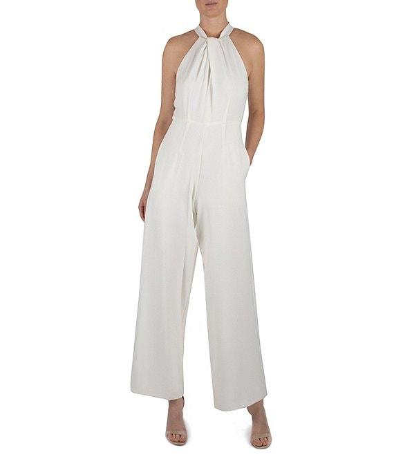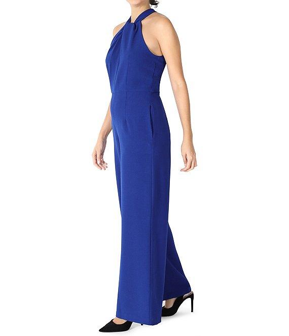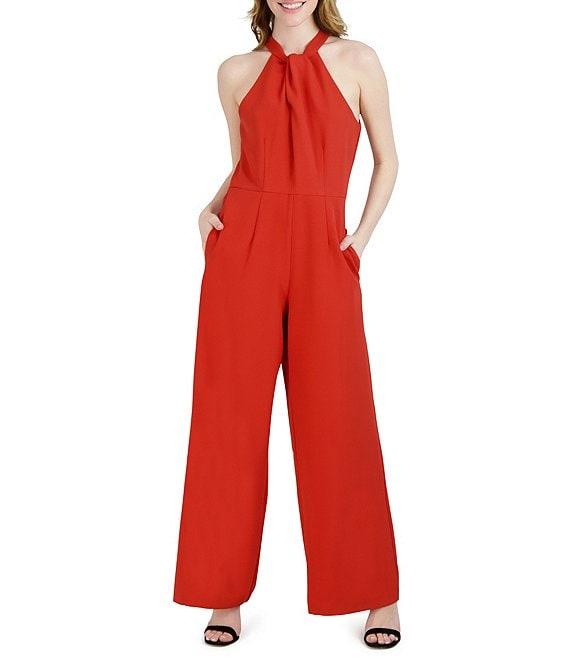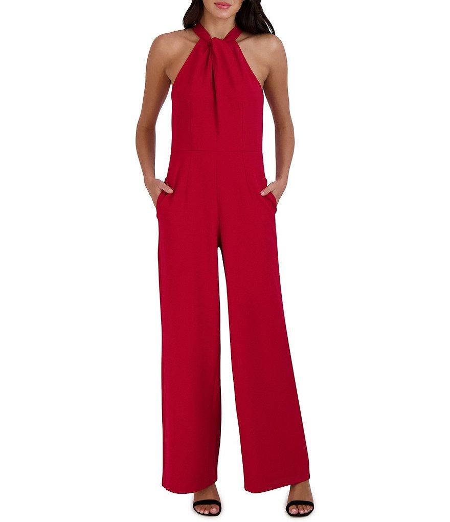 From Julia Jordan, this jumpsuit features: Twisted halter necklinesleevelesspocketsbuttons at neck detail intended to hit the floorlinedgold button and zipper closureapprox. 31" from shoulder to hempolyester/spandexmachine wash cold/tumble dry lowImported.