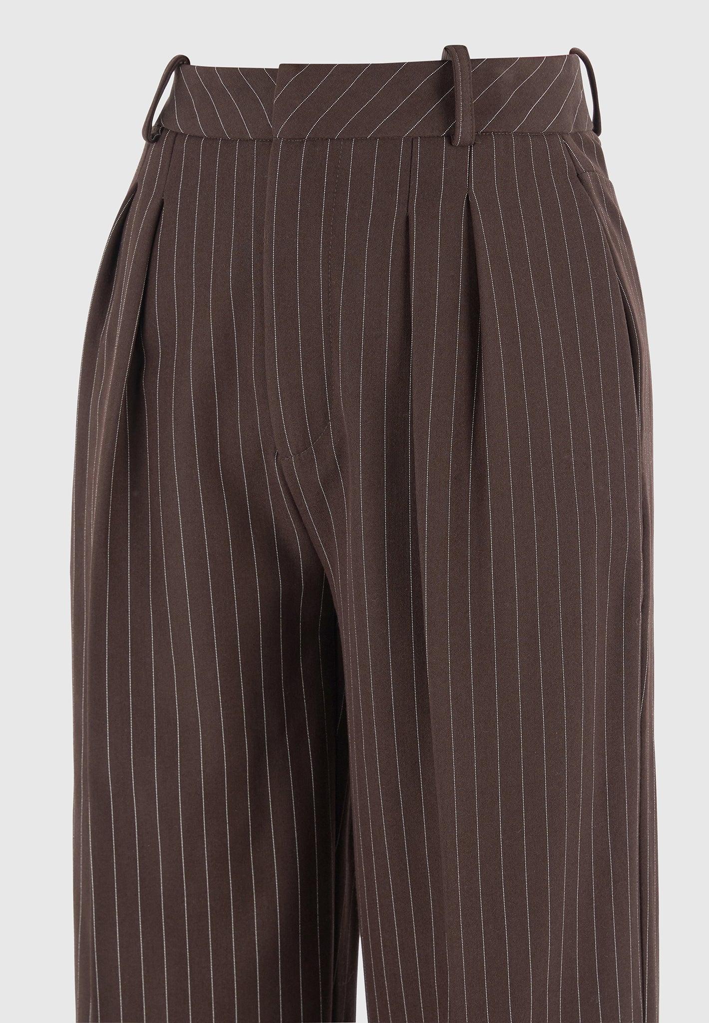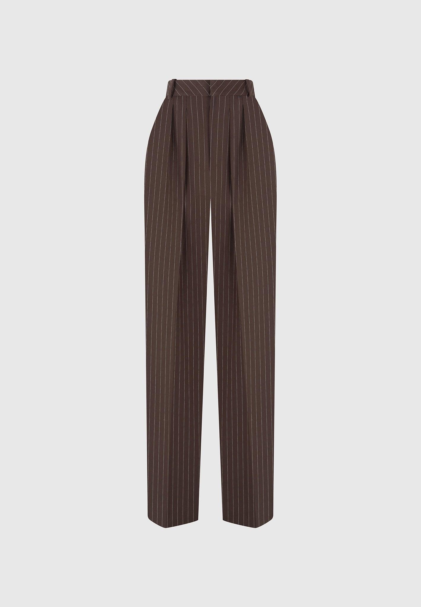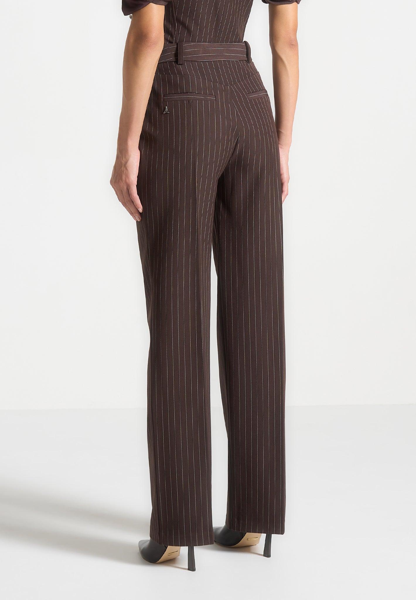 Experience classic style and versatility with our Pinstripe Twin Pleat Tailored Trousers. The straight leg fit and pleat detail give a polished, tailored look, perfect for any occasion from day to night. Trousers Silhouette Straight Leg Fit Side Slip Pockets Functional Fly Closure Belt Loops Tonal Maniere De Voir Eiffel 80% Polyester, 16% Rayon, 4% ElastaneAlways check the care label for wash instructions.