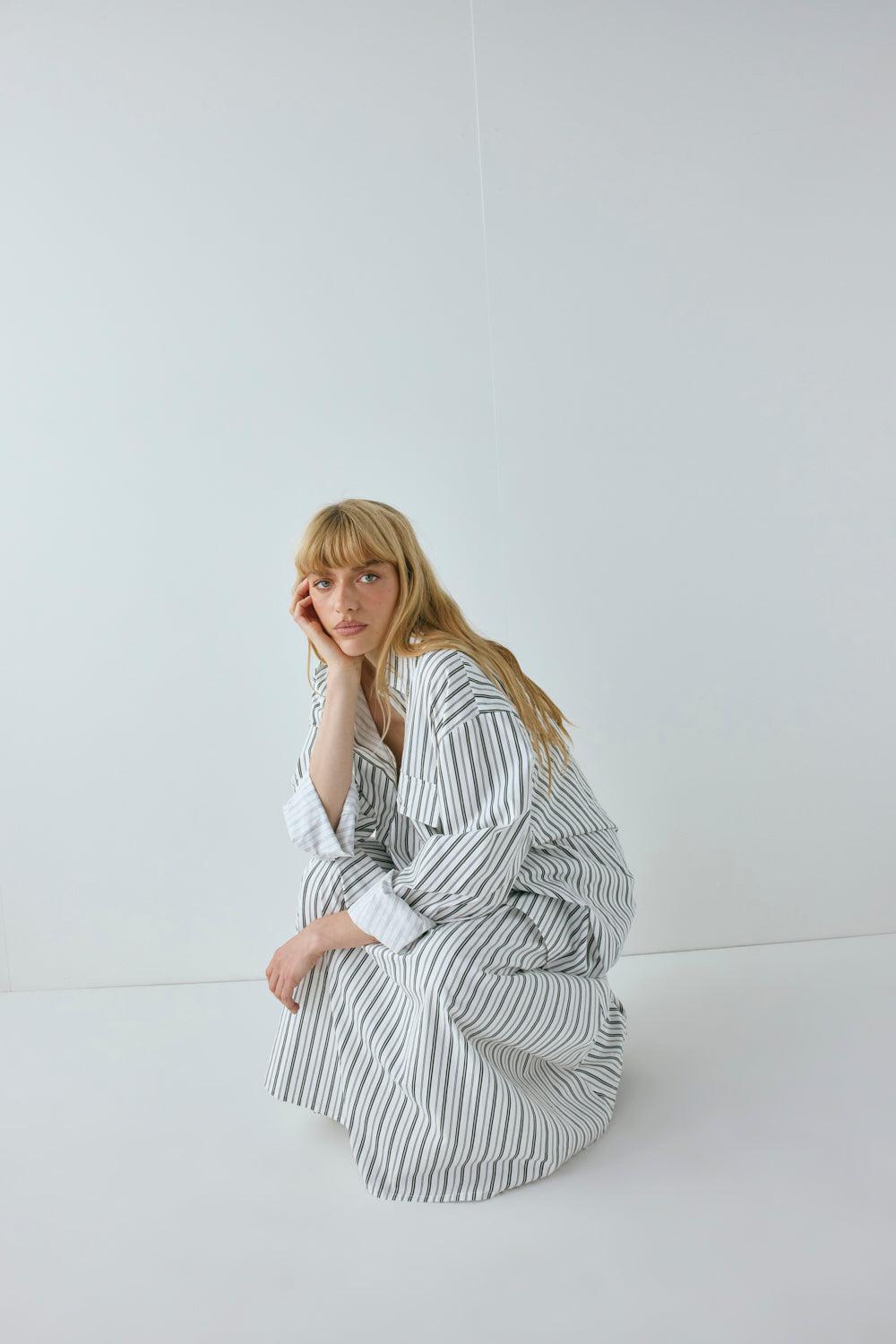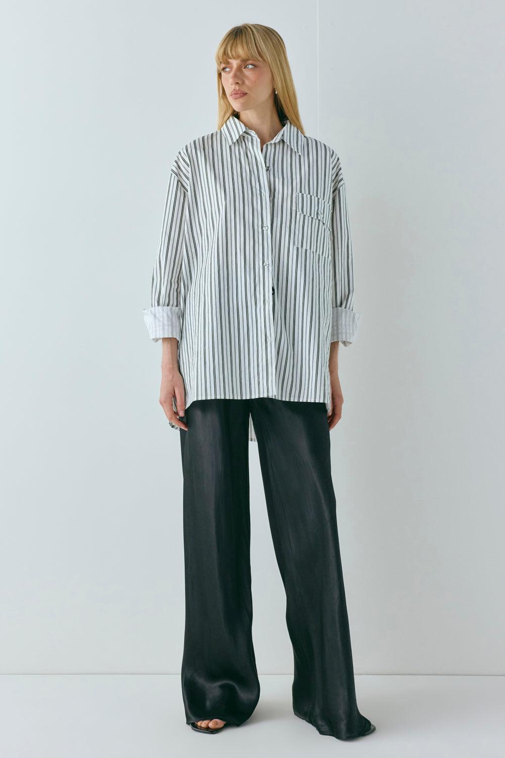 The June Shirt in Black Stripe is made from 100% cotton. Features an oversized fit, centre front buttons and button-up cuffs. Designed in Australia.