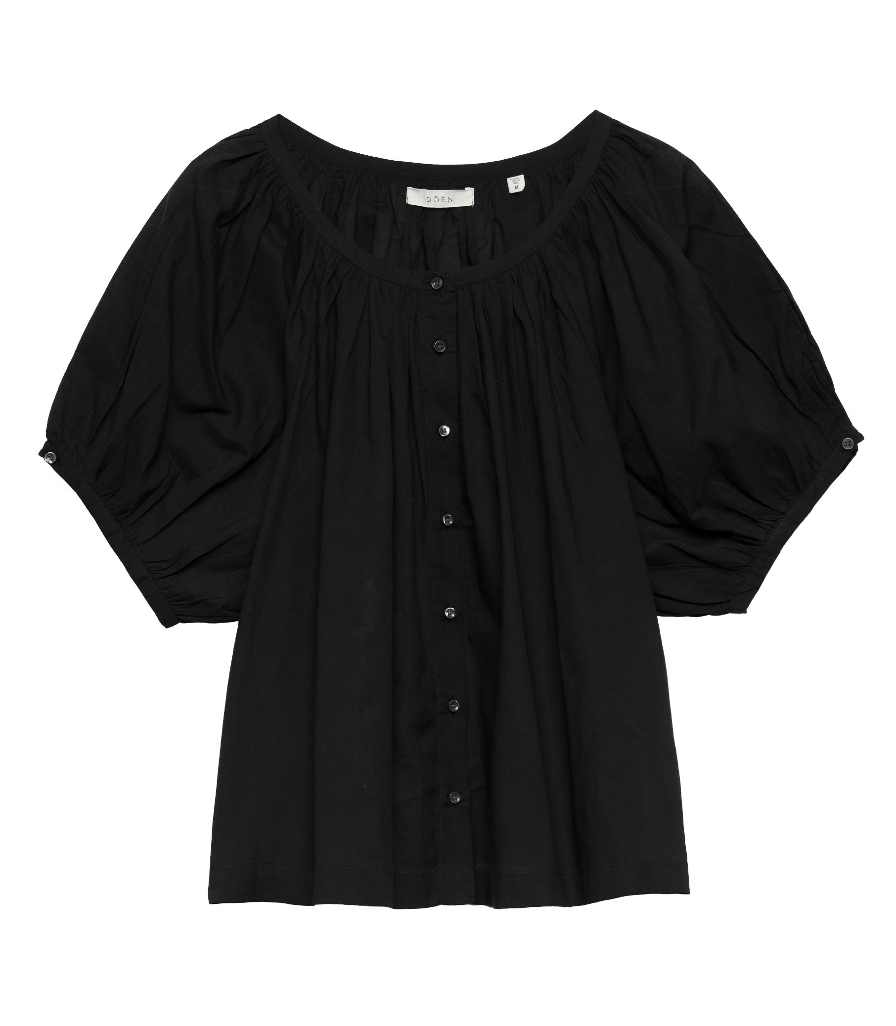 Crafted from a lightweight blend of organic cotton and viscose, the June Top is a short-sleeved take on our beloved Jane Blouse. It features a gathered scoop neckline, full raglan sleeves, and a relaxed, breezy cut. A line of mother-of-pearl buttons extends down the center front. Wear it loose, or tuck it into your favorite high-waisted jeans or shorts.