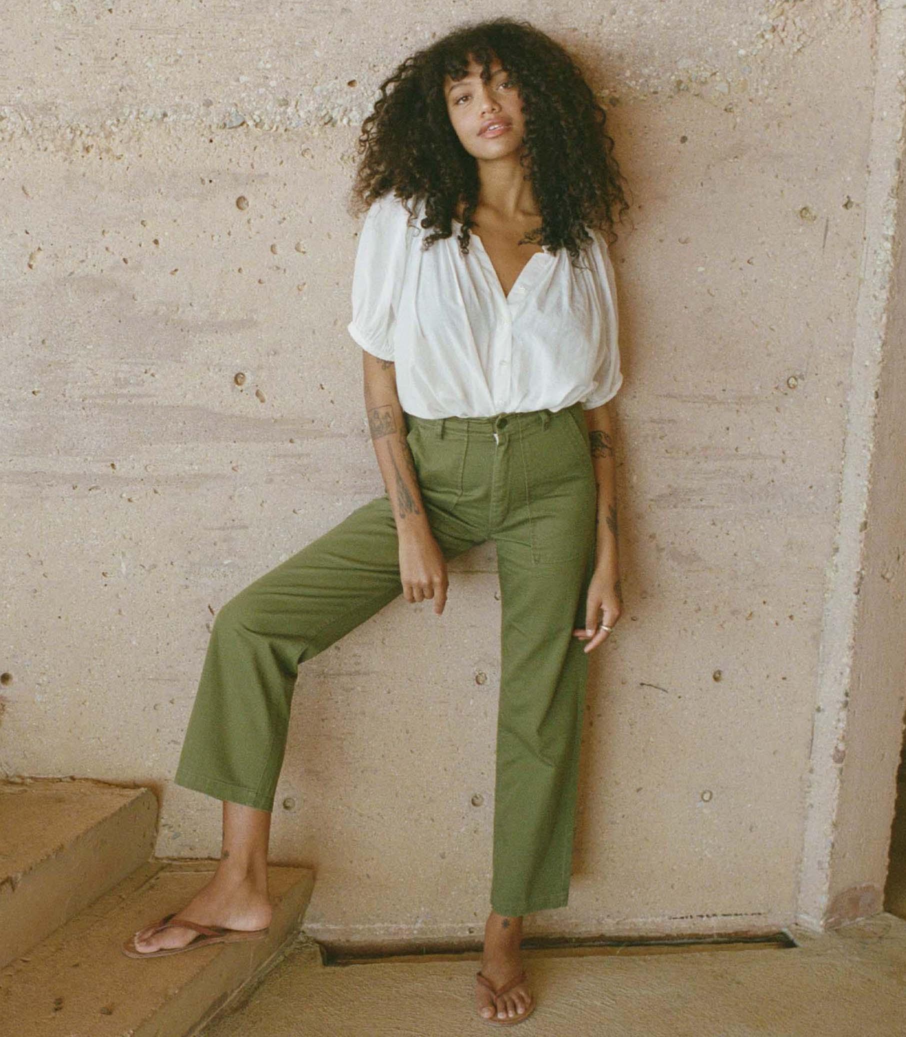 Crafted from a lightweight blend of organic cotton and viscose, the June Top is a short-sleeved take on our beloved Jane Blouse. It features a gathered scoop neckline, full raglan sleeves, and a relaxed, breezy cut. A line of mother-of-pearl buttons extends down the center front. Wear it loose, or tuck it into your favorite high-waisted jeans or shorts.