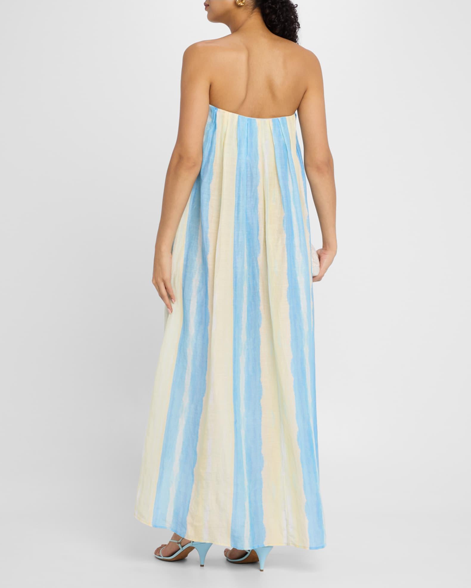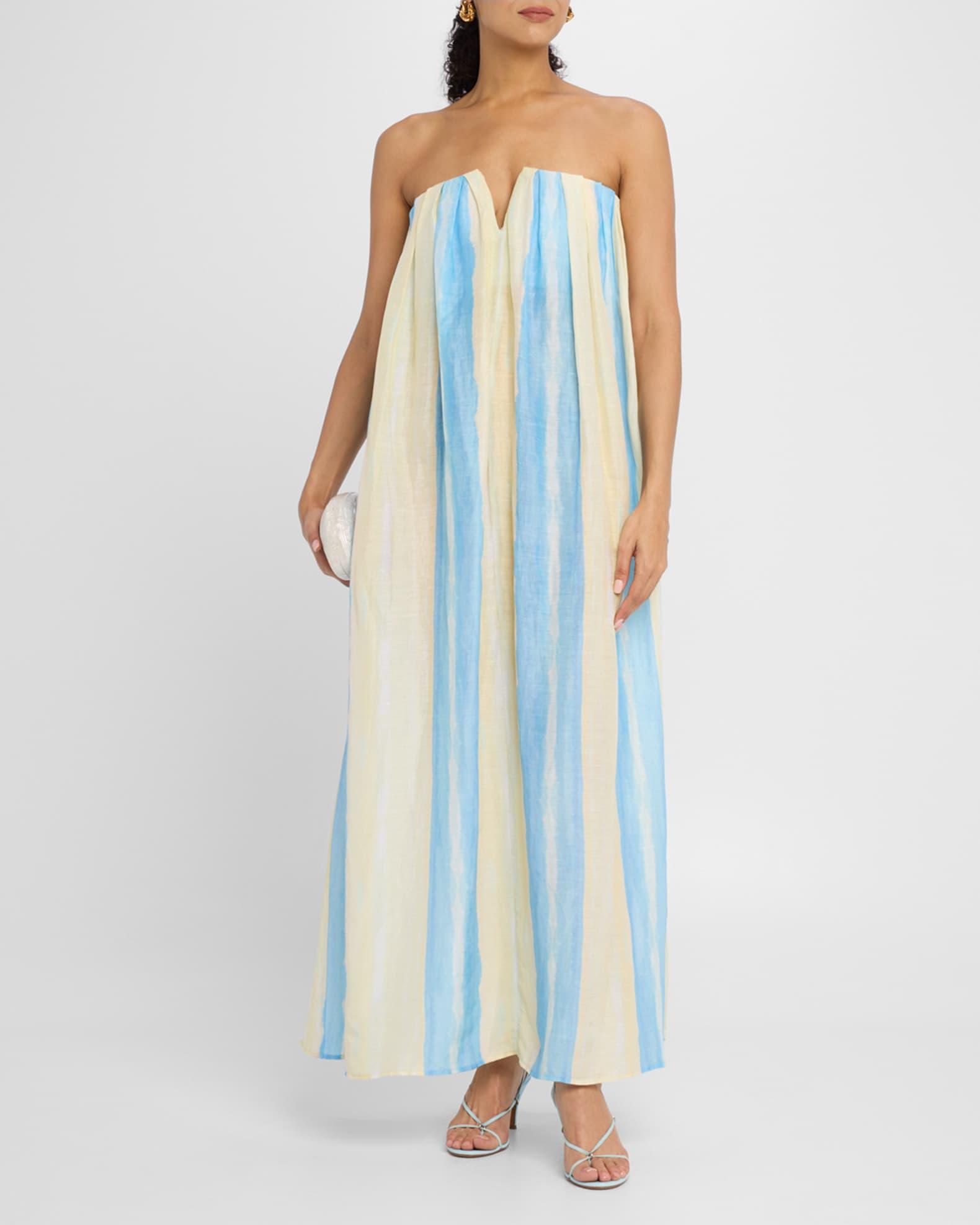 Featuring a bold placement print, the "Juniper" maxi dress by Significant Other exudes elegance and elevates the classic strapless silhouette. Strapless V neckline Sleeveless Flowy silhouette Full length Slipover style Linen/Bemberg® cupro/lyocell Lining: Cotton Hand wash or dry clean Imported