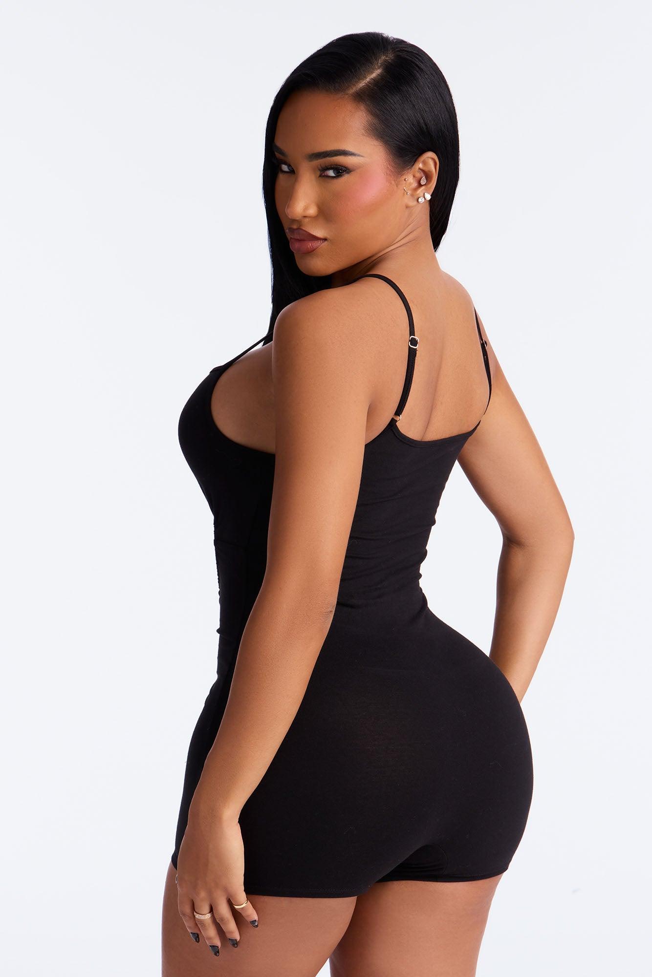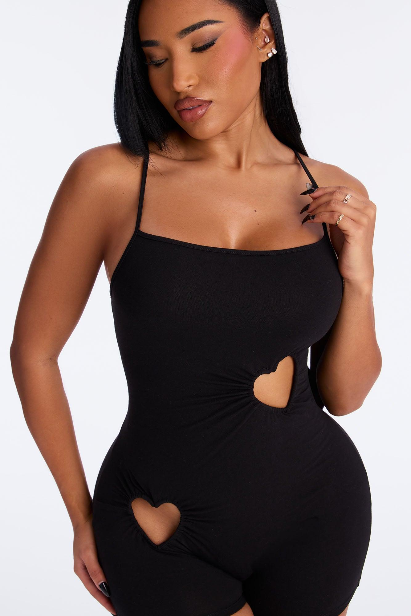 Available In Black. PJ Romper Adjustable Straps Heart Cut Outs Stretch Final Sale Self: 95% Cotton 5% Spandex Imported