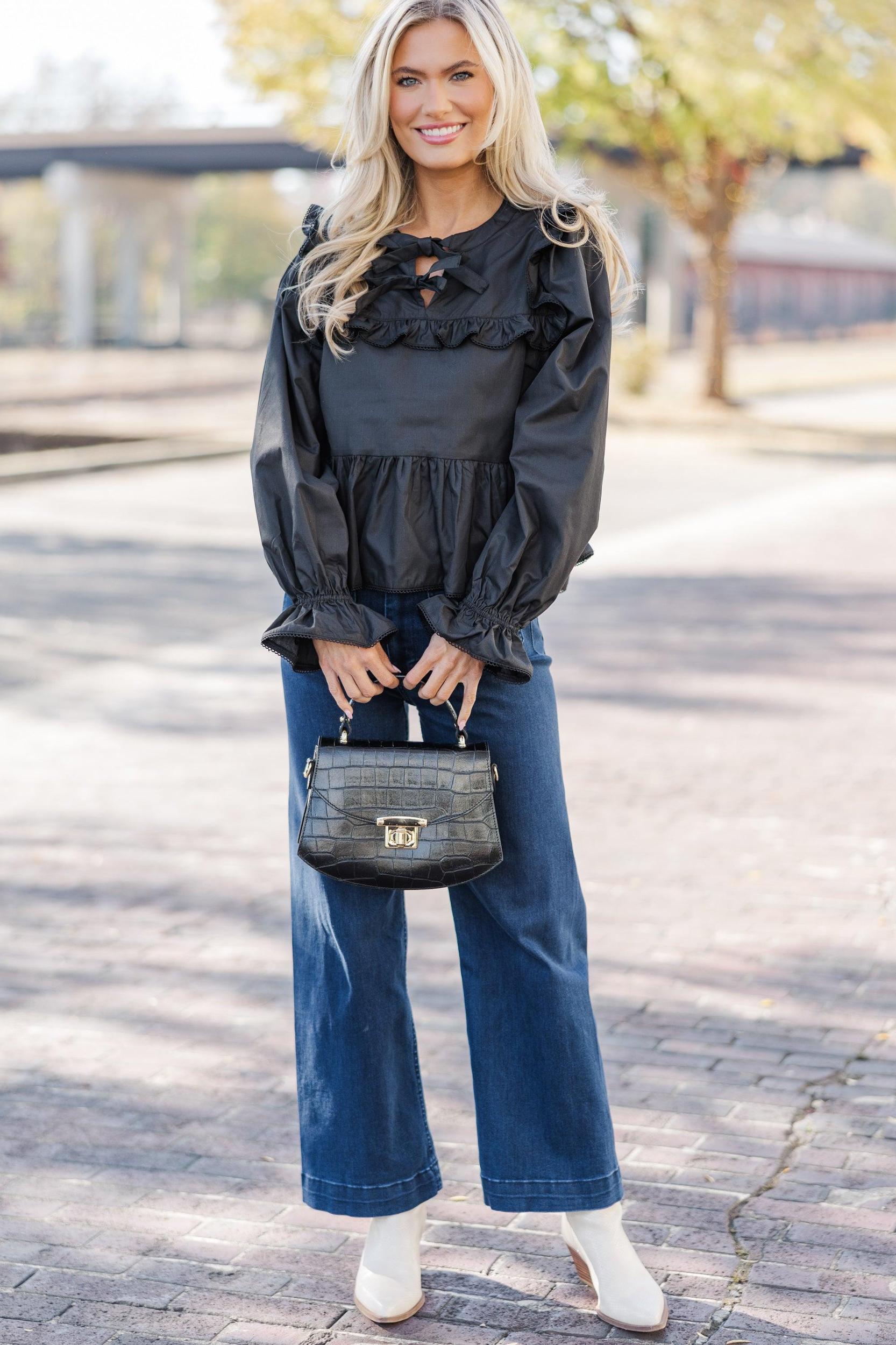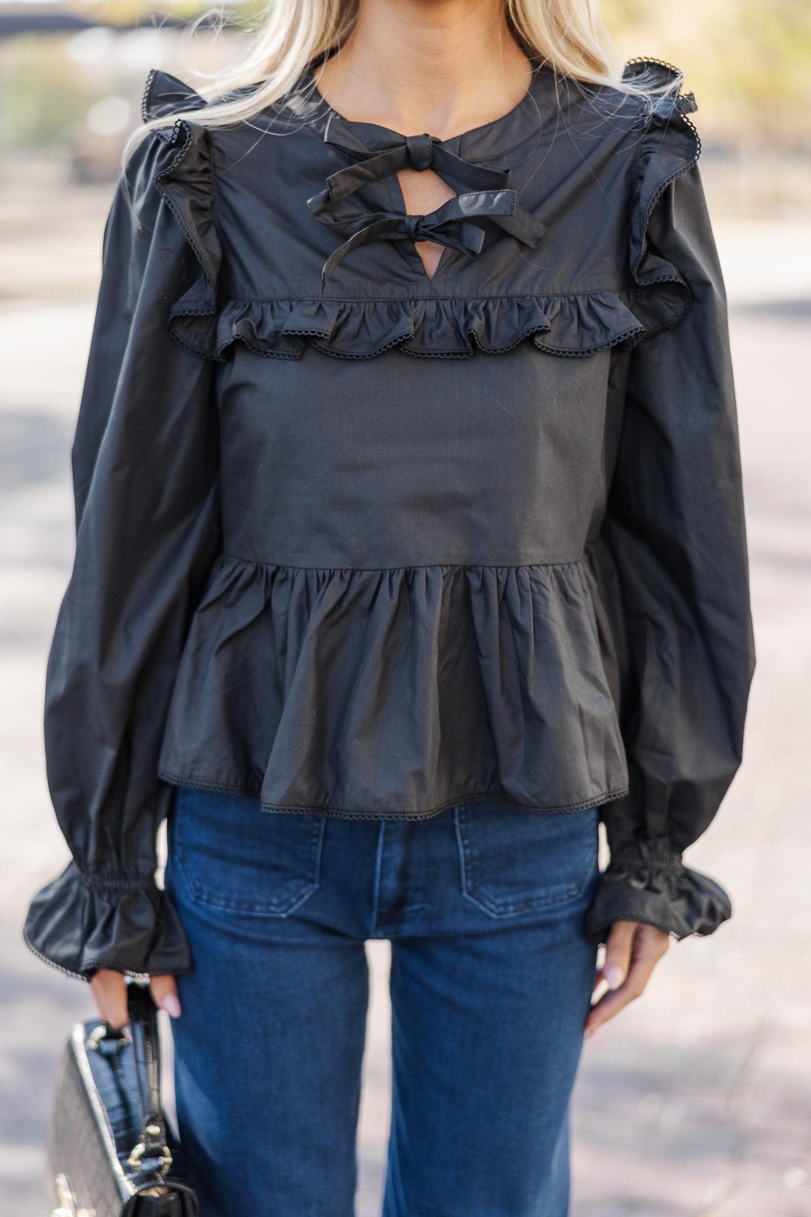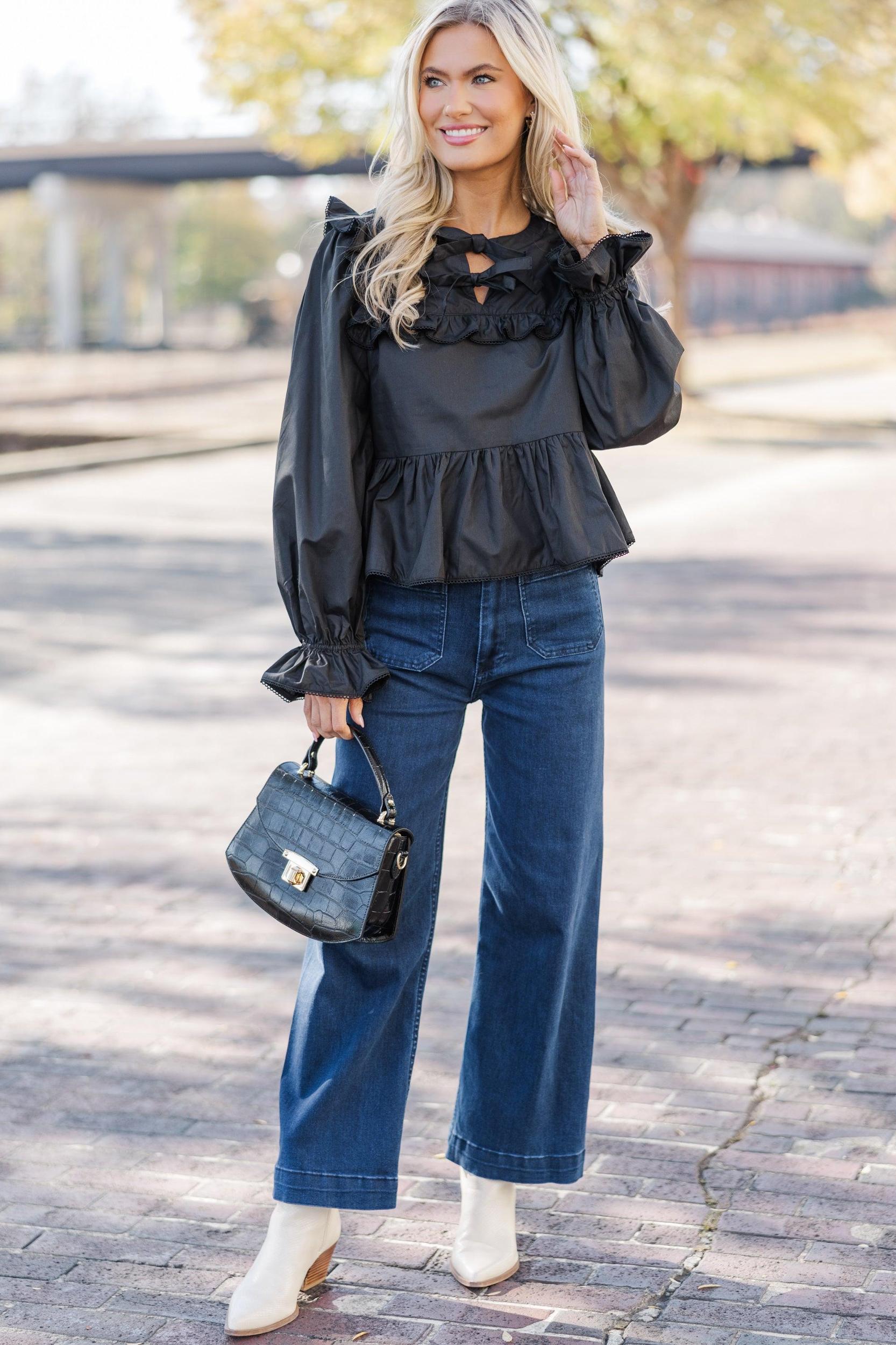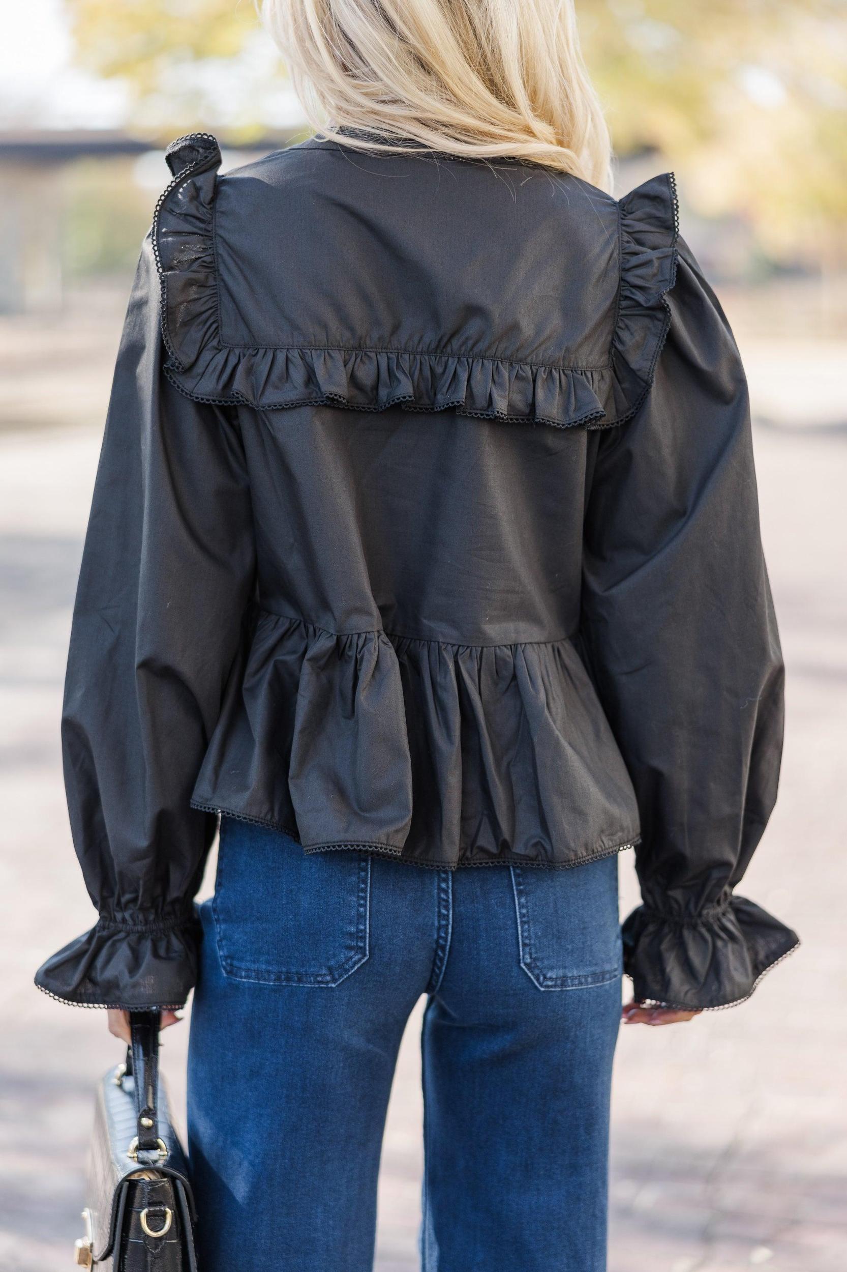 Just a thought... we think you need this blouse! Just look at it! It's so femininely dramatic and chic! All of that ruffled detailing and the peplum waist are perfectly paired! This blouse is going to look great with jeans this fall! V-neckline with tied bow details Long bubble sleeves with elastic cuffs Peplum Ruffled detailing No stretch Baileigh is wearing the small.