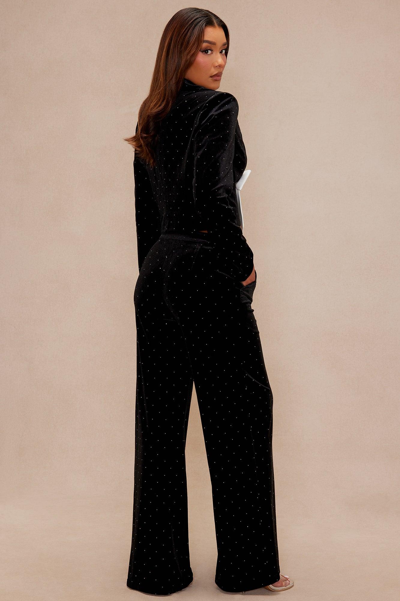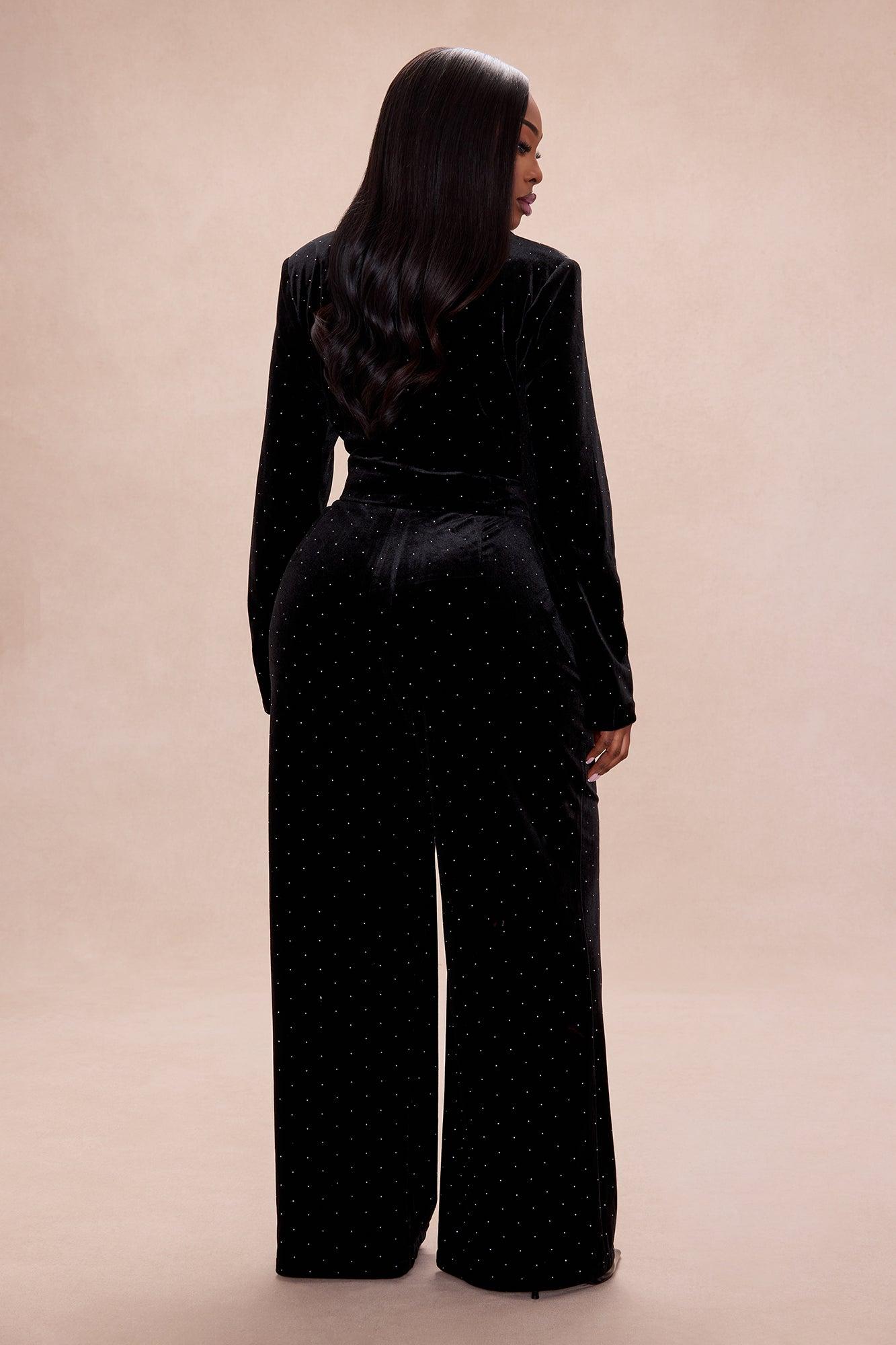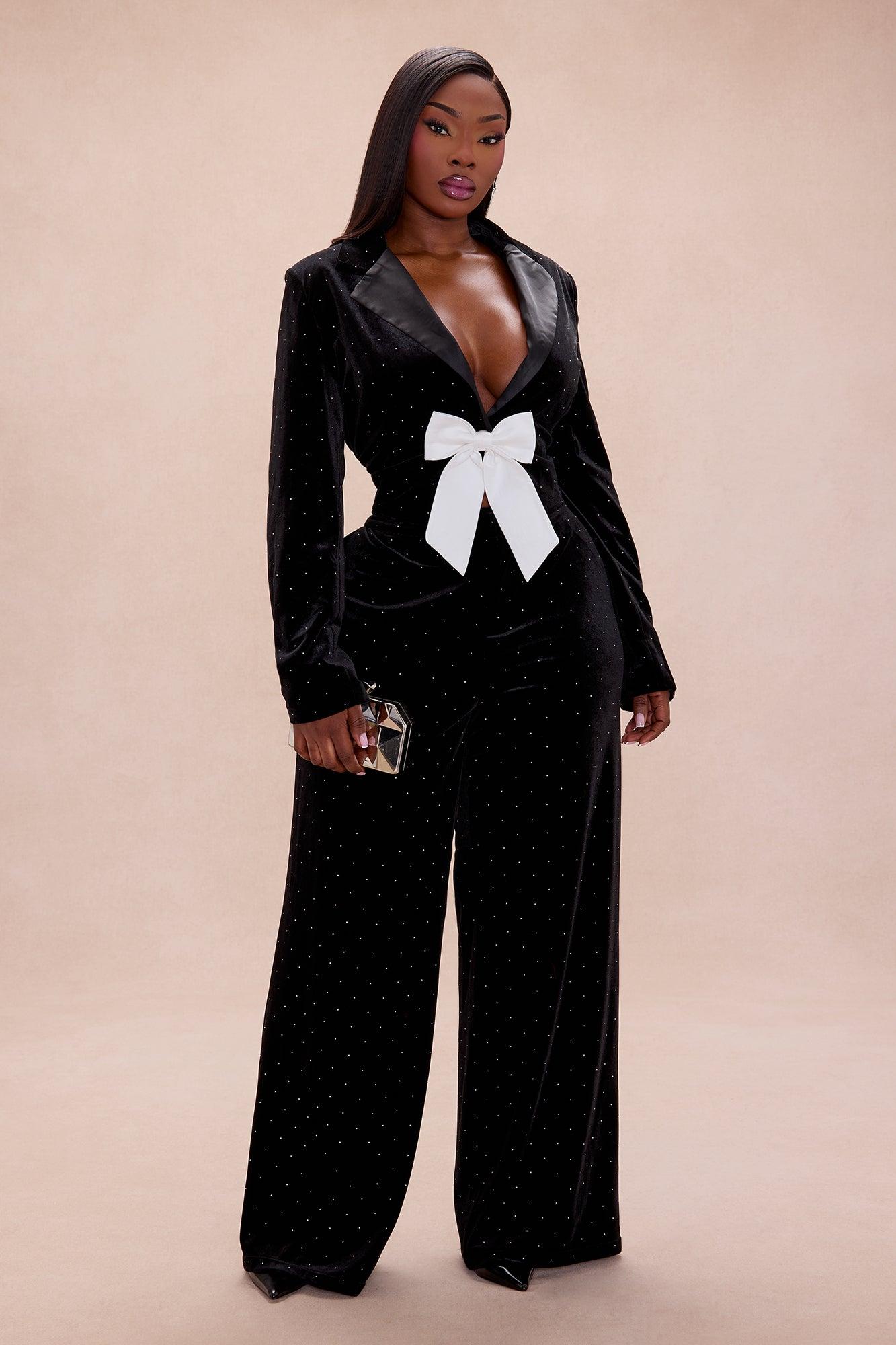 Available In Black. Velvet Embellished Blazer Pant Ensemble Long Sleeve Shoulder Pads Collared Bow Detail Front Button Closure Lined Non Stretch High Waisted Wide Leg Pant Pockets Front Hook And Zipper Closure Shell: 95% Polyester 5% Spandex Lining: 100% Polyester Imported