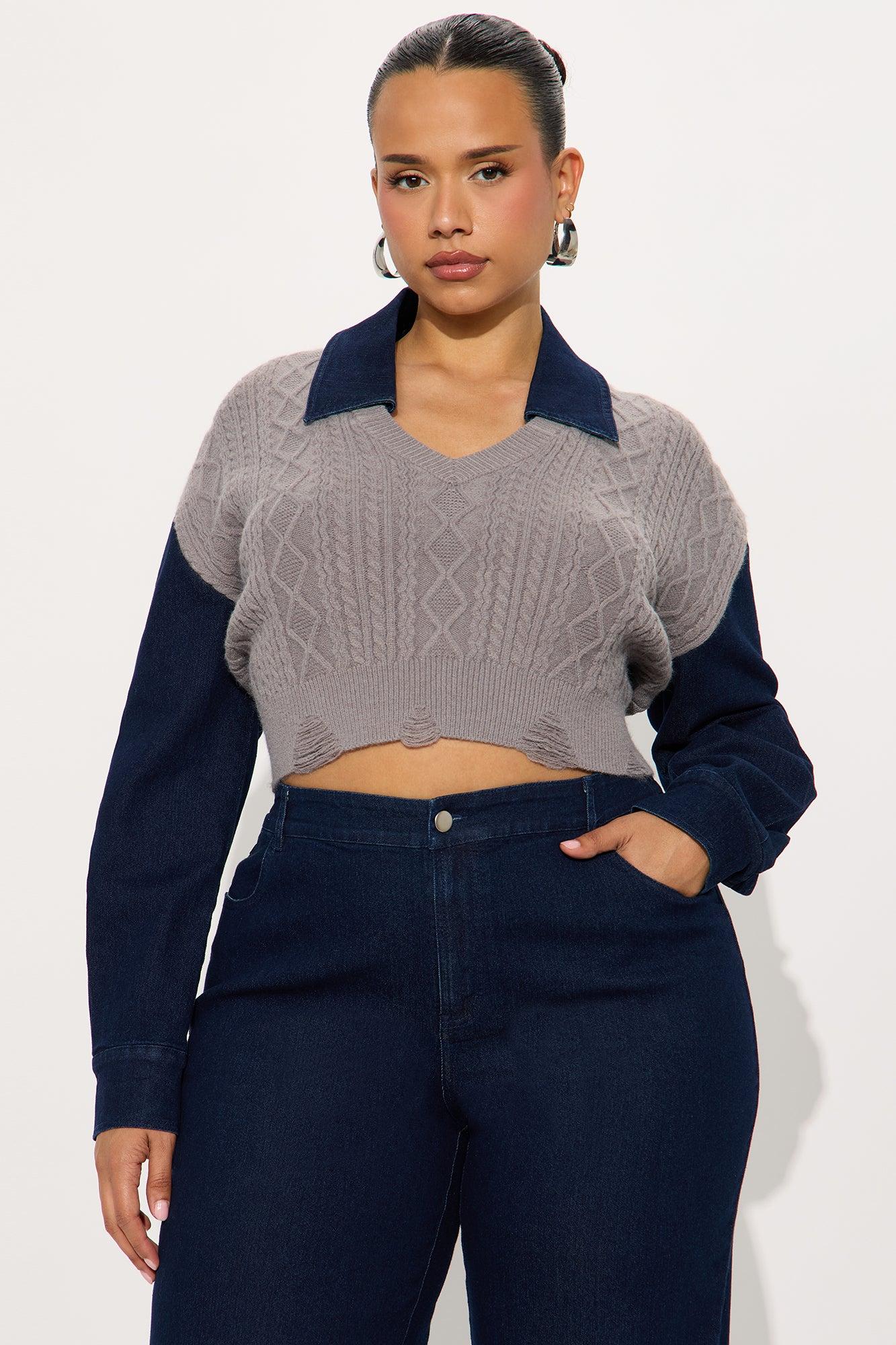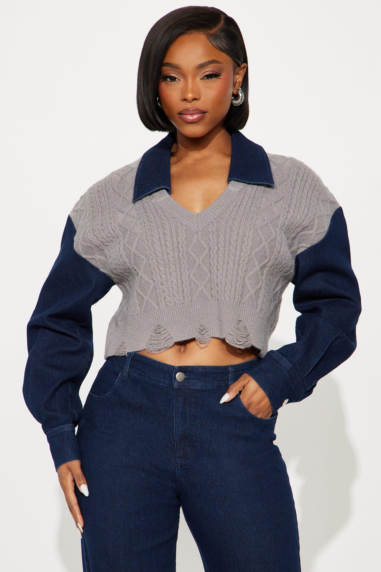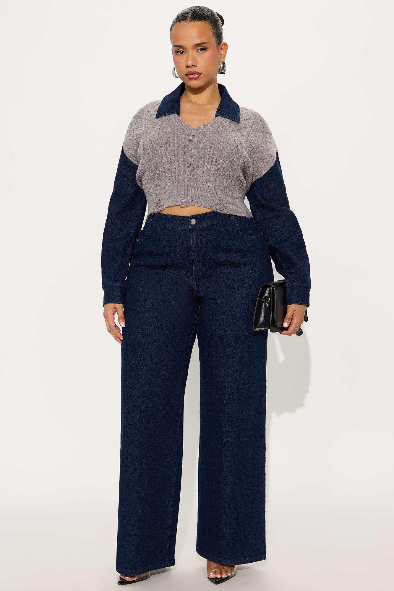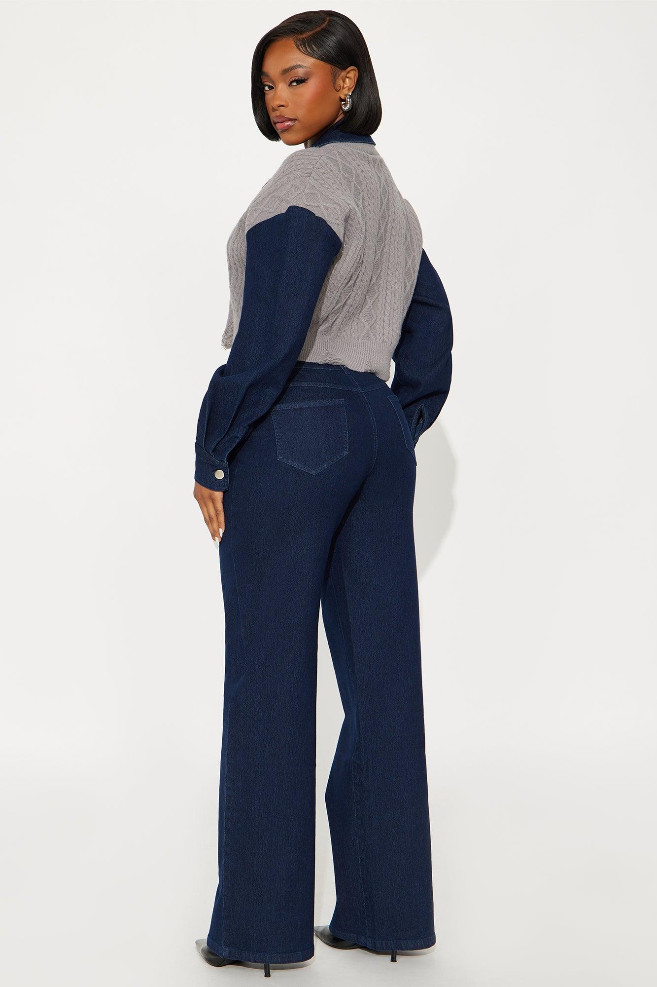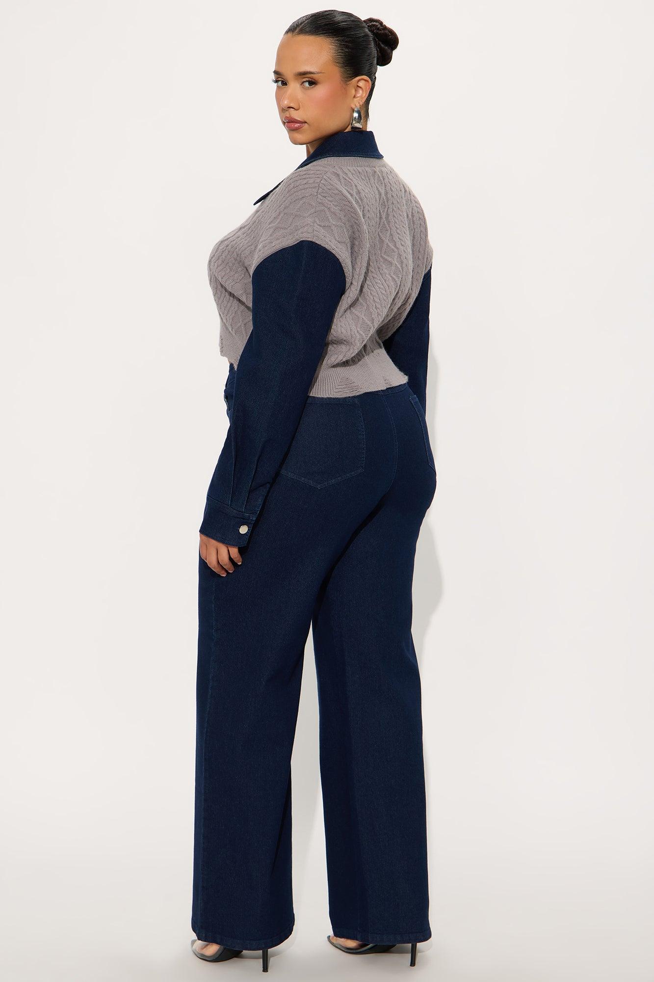 Available In Denim. 2 Piece Ensemble Polo Sweater And Pant Set Stretch Long Sleeve Pockets Wide Leg 34" Inseam Self Top: 52% Acrylic 28% Nylon 20% Polyester Contrast: 75% Cotton 23% Polyester 2% Spandex Bottom: 75% Cotton 23% Polyester 2% Spandex Imported