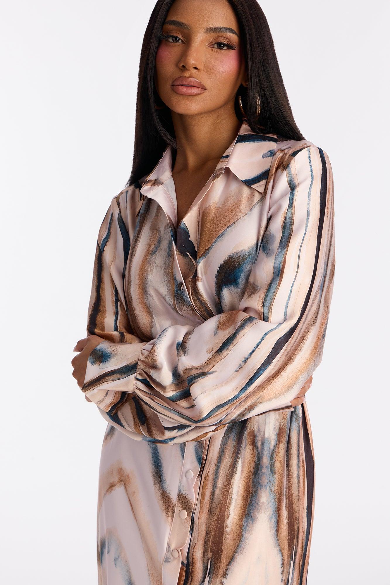 Available In Brown Combo. Satin Midi Dress Collar Long Sleeve Belted Snap Button Up Lined Length Measured Flat = 45" Disclaimer: Print Placement May Vary Self: 100% Polyester Lining: 100% Polyester Imported California Proposition 65WARNING: Cancer and Reproductive Harm - www.P65Warnings.ca.gov.