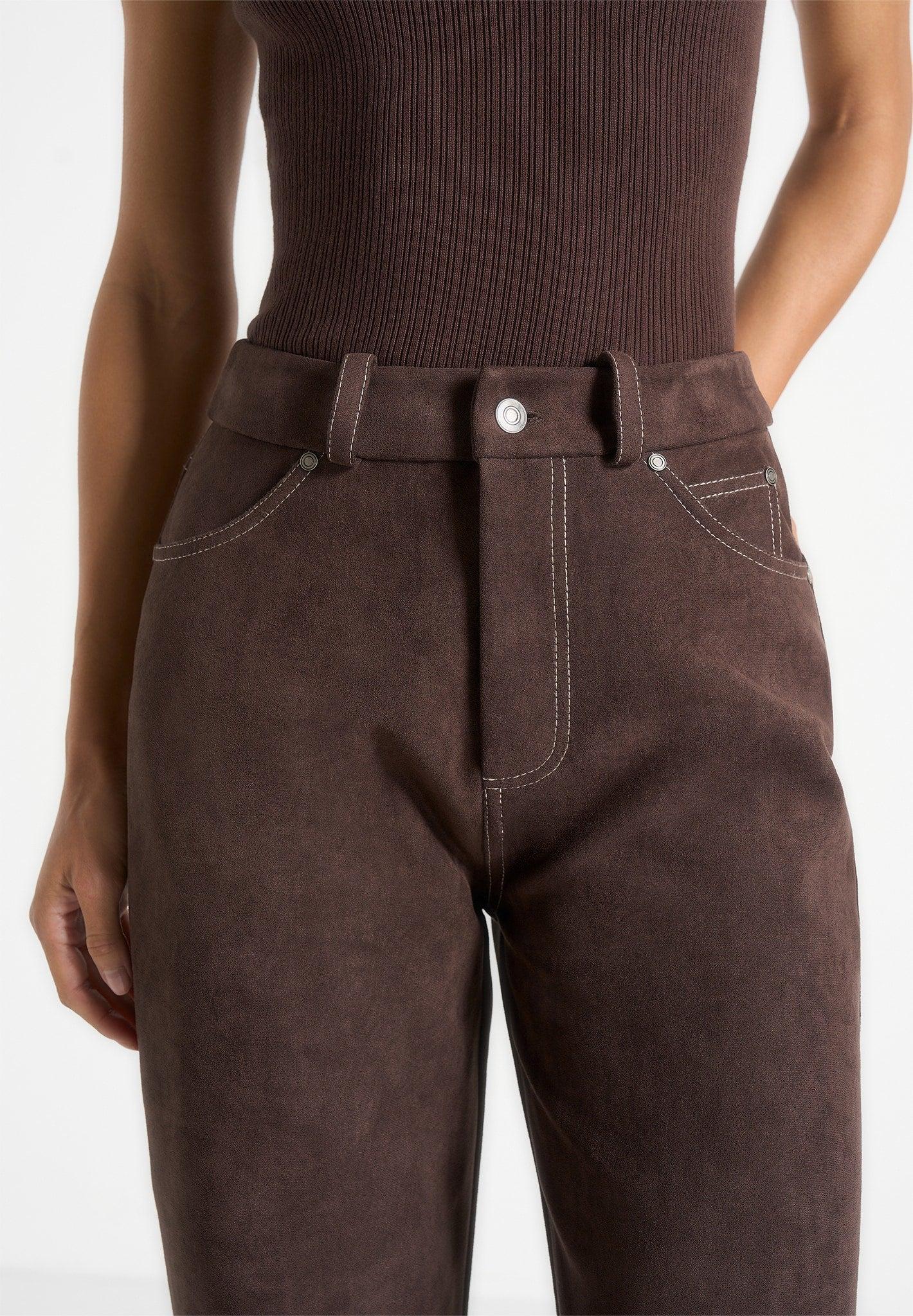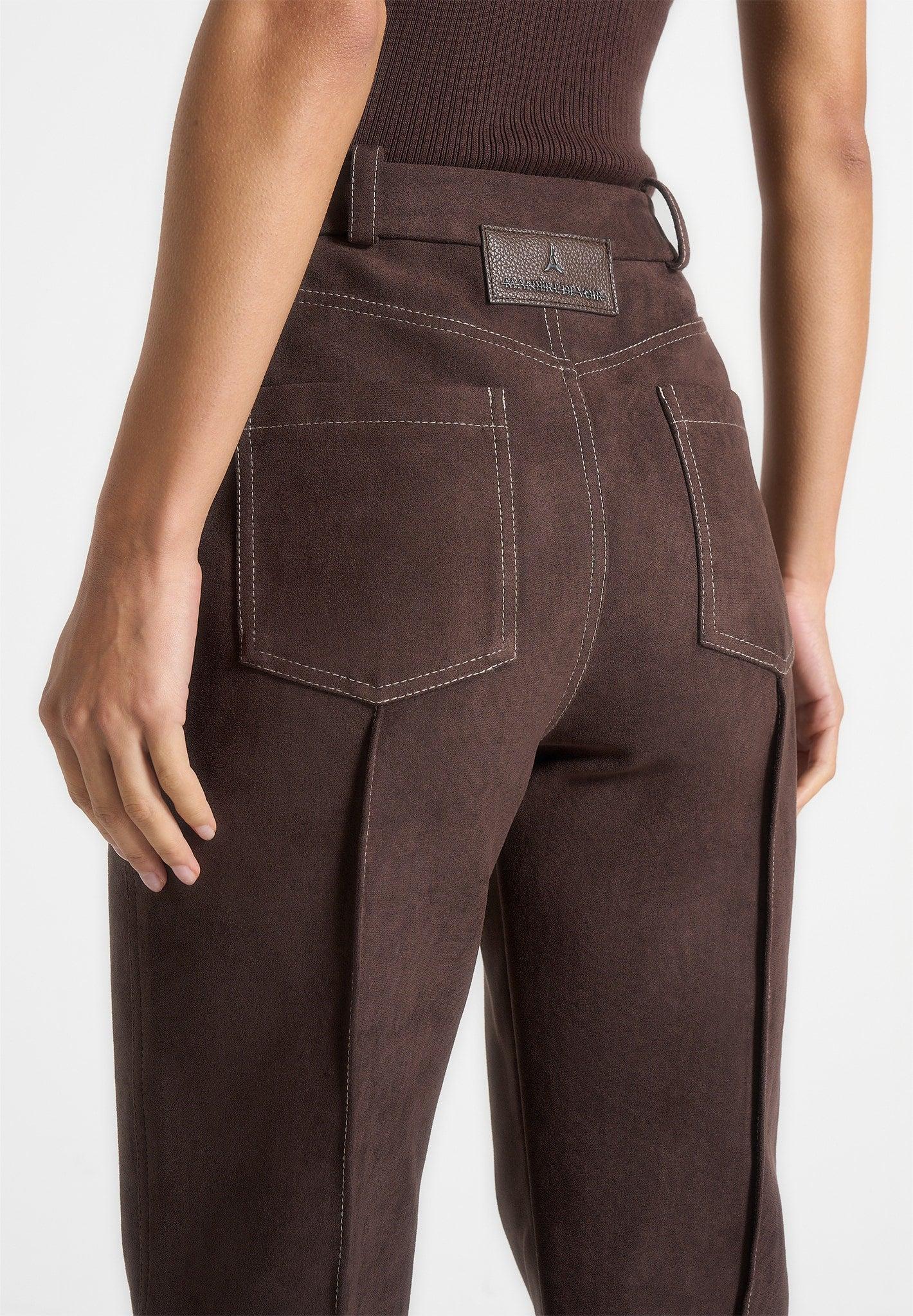 Crafted from soft suede with contrast stitching, these boyfriend jeans bring a relaxed edge to a timeless silhouette. The straight leg cut offers a classic yet versatile fit, while front and back panelling add elevated structure and detail. Adjustable waist tabs allow for a customisable fit, combining everyday comfort with premium design. Straight leg silhouette for a classic, versatile fit Soft suede fabric with contrast stitching for visual definition Front and back panelling for elevated structure and detail Adjustable waist tabs for a customisable fit Tonal Manière De Voir vegan leather Eiffel patch to centre back