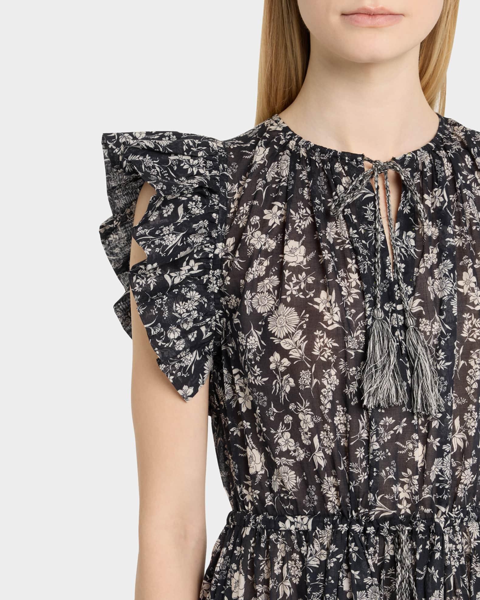 Ulla Johnson "Kalina" floral-printed sun dress coverup finished with tassel tie ends Round neckline with optional self-ties Short flutter sleeves Self-tie drawstring waistband Hem falls above the knee Slipover style Cotton Imported