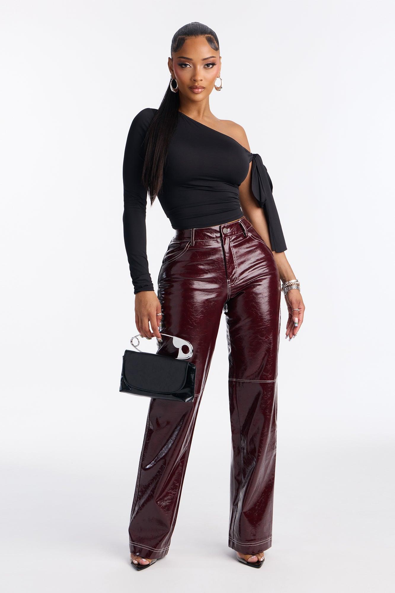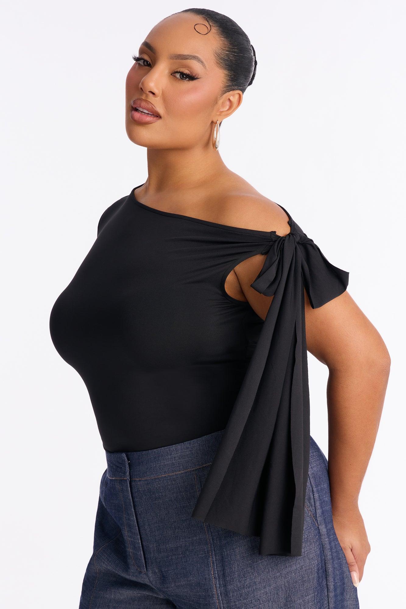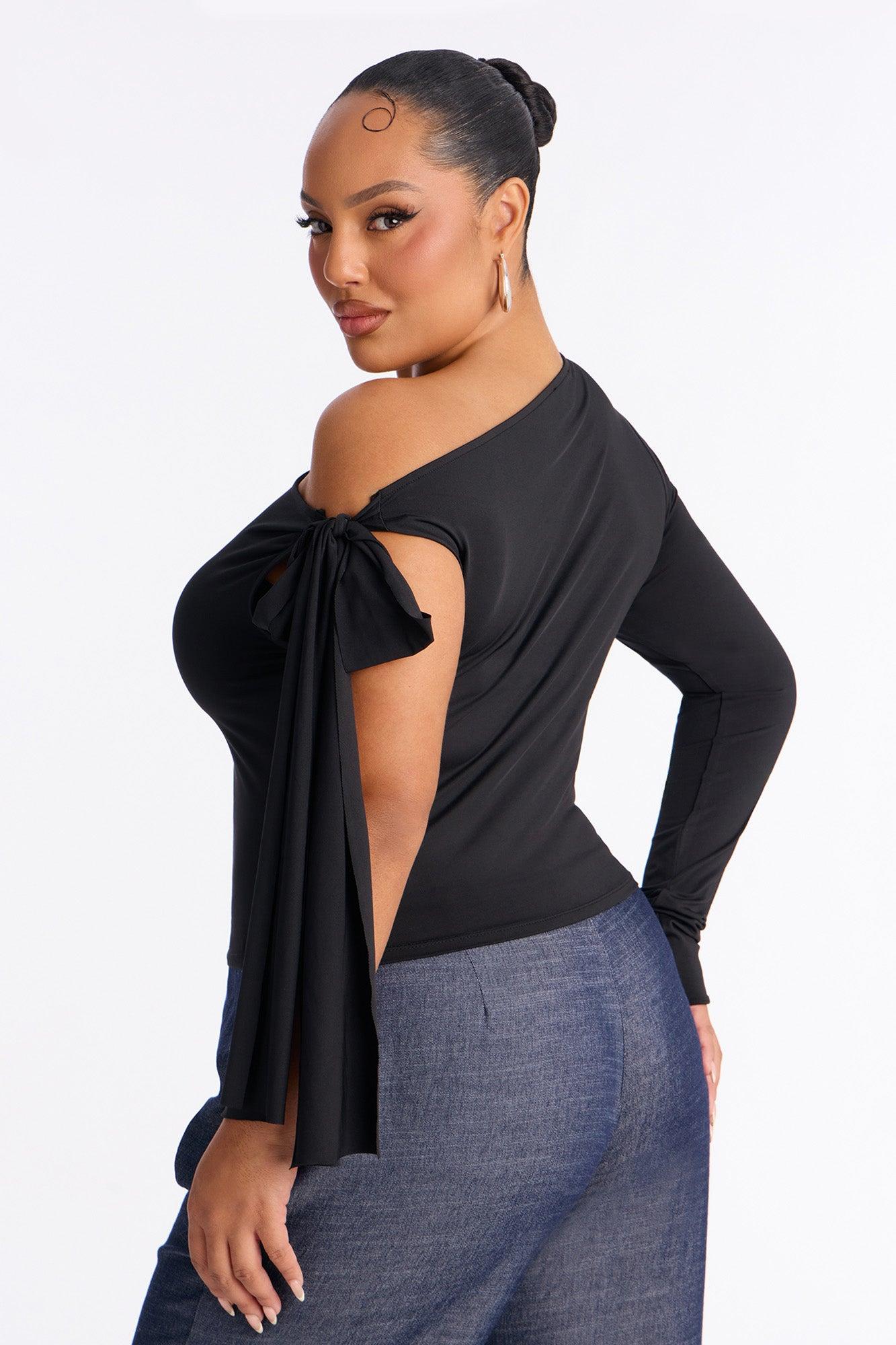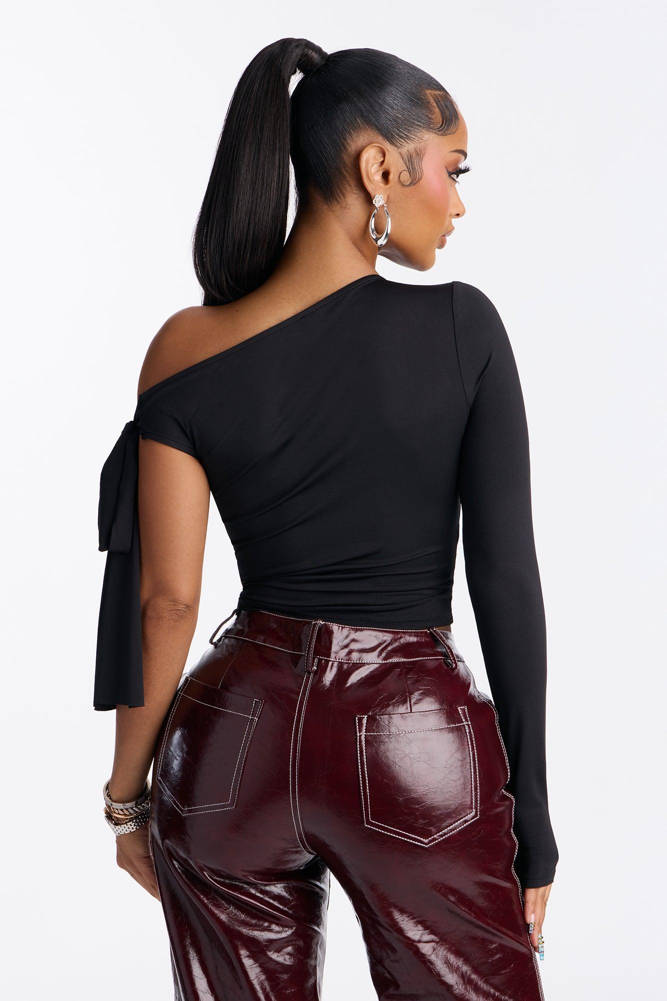 Available In Black And Red. Off Shoulder Top Long Sleeve Side Tie Waist Stretch Self : 95% Polyester 5% Spandex Imported California Proposition 65WARNING: Cancer and Reproductive Harm - www.P65Warnings.ca.gov.