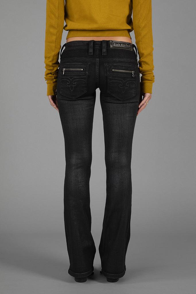 Kamil Super Low-Rise Moto Bootcut Jeans by Rock Revival features a super-low-rise rise with a bootcut silhouette crafted in a black wash, designed in Los Angeles.